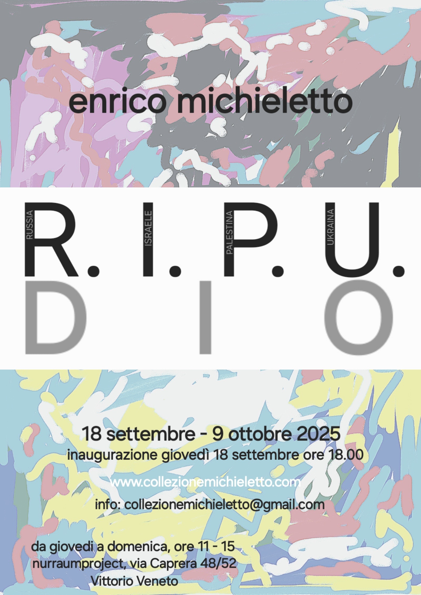 nurraumproject di Vittorio Veneto presenta l'ultimo lavoro di Enrico Michieletto (Charleroi 1962). L'autore in questa occasione analizza la parola "Ripudio" per approfondirne il significato e ipotizzare una nuova lettura. La parola viene scomposta in due parti, nella prima Michieletto mette in risalto le iniziali dei quattro paesi coinvolti nelle due guerre attualmente in corso (Russia - Israele - Palestina - Ucraina). Nella seconda "DIO" esprime l'idea di speranza affinchè questi e altri conflitti possano terminare.