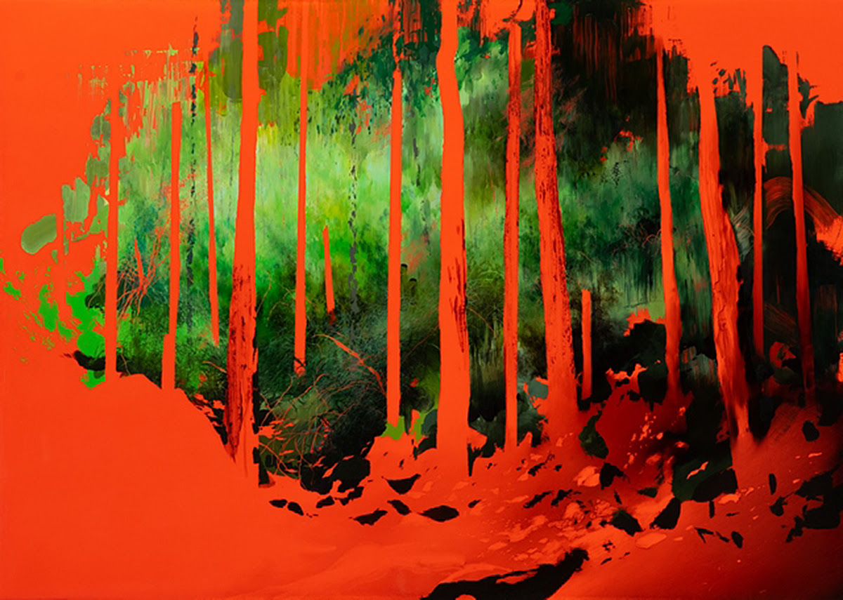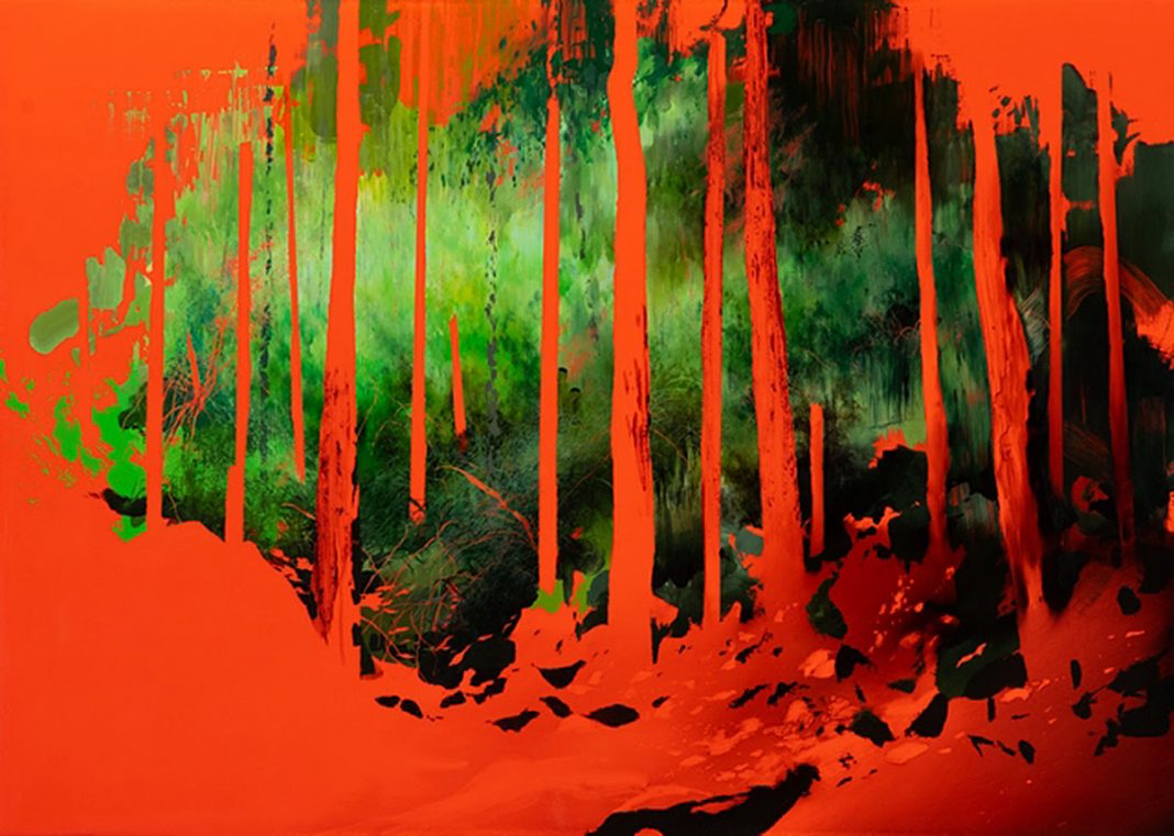 Al piano terra del Museo e presso la Galleria Il Pomo da DaMo saranno esposte le opere pittoriche, paesaggi ad olio che si sovrappongono a fondi monocromi fluorescenti mentre le opere scultore anch’esse pigmentate con colori fluorescenti, trovano invece spazio all’interno delle vetrine del Museo Scarabelli