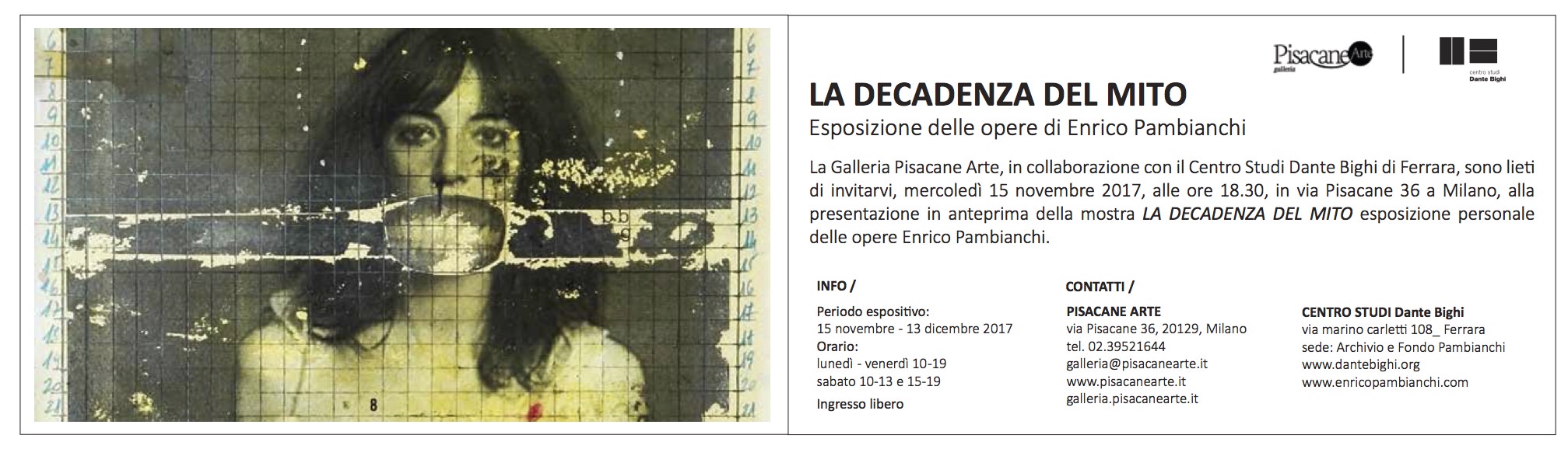 La galleria Pisacane Arte, in collaborazione con il Centro Studi Dante Bighi, di Ferrara, inaugurerà mercoledì 15 novembre alle ore 18.30, in via Pisacane 36 a Milano, LA DECADENZA DEL MITO esposizione personale delle opere Enrico Pambianchi.