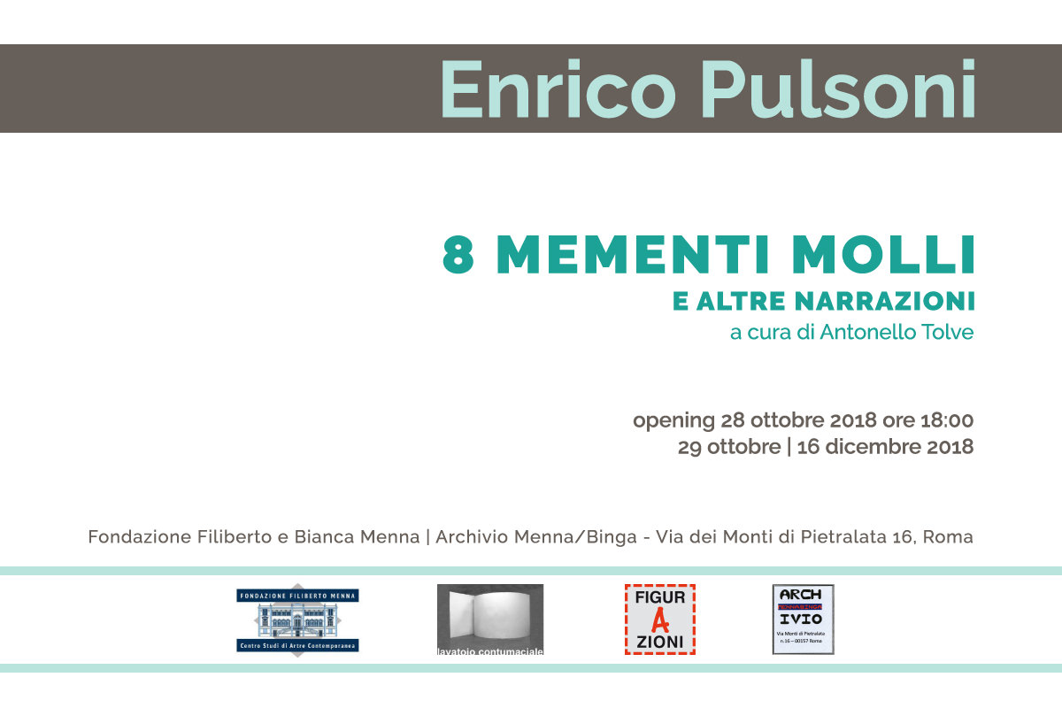 La Fondazione Filiberto e Bianca Menna, in collaborazione con il Lavatoio Contumaciale e con l’Associazione FigurAzioni, è lieta di annunciare 8 mementi molli, e altre narrazioni, una importante mostra di Enrico Pulsoni che si terrà nella sede romana della Fondazione, già sede dell’Archivio Menna/Binga.
