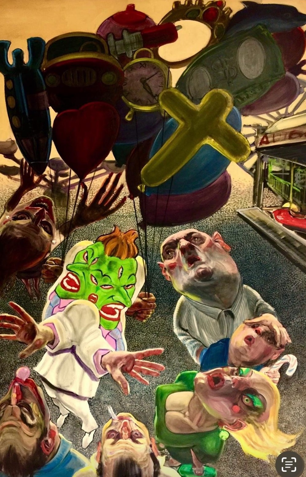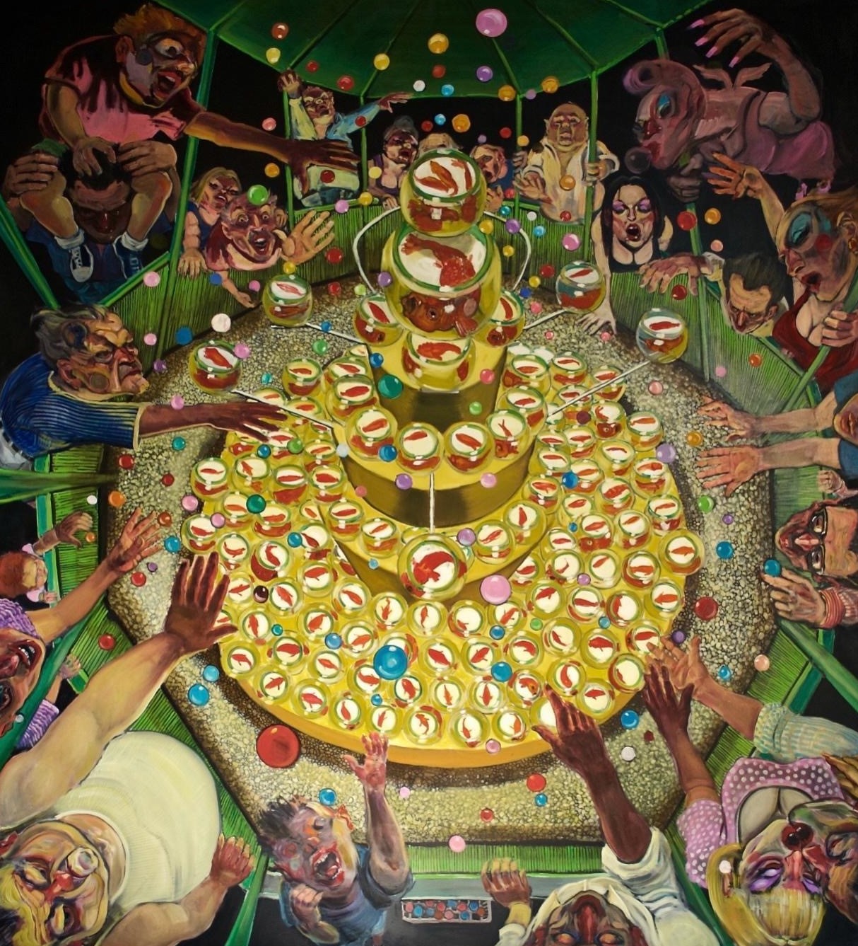 Il titolo dell’esposizione – Bombe e bomboloni, tuffi, tanfi e finti fanti – corrisponde ad un testo complesso, articolato alla Wertmüller, riccamente retorico in senso letterario, che rende però tangibile il momento presente tra guerre, violenza e stordimento giocondo. Una dura accusa alla società contemporanea che si traduce in una pittura di grande sapienza e invenzione, tra letteratura, oralità, scrittura e citazioni tratte dalla storia dell’arte.