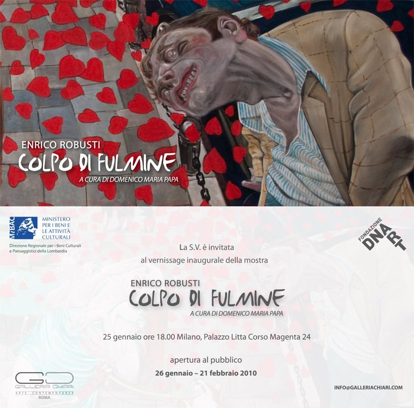 Robusti Colpo di Fulmine, un percorso attraverso una trentina di opere dell’artista parmigiano, realizzata dalla Direzione Regionale per i Beni Culturali e Paesaggistici della Lombardia e dalla Fondazione DNArt, in collaborazione con la Galleria Chiari di Roma. Il nuovo appuntamento con l'arte contemporanea, a seguito delle recenti iniziative come la mostra di Giorgio Ramella e le luci d'artista di Carlo Bernardini, offre ancora una volta l'occasione di visitare e ammirare Palazzo Litta, uno degli edifici storici più belli e significativi di Milano, sede della Direzione Regionale per i Beni Culturali della Lombardia.La scelta del titolo della mostra, tratto da quella che ne è l’opera simbolo, afferma Mario Turetta, Direttore Regionale per i Beni Culturali, non è casuale ma rimarca come, oggi, nella nostra società, l’amore sia un sentimento sempre prezioso. Con Colpo di fulmine si celebrerà attraverso l'arte anche la festività di San Valentino, come è ormai consuetudine a Palazzo Litta. Il percorso espositivo, attraverso le sale del piano nobile, volge all'umanità intera uno sguardo grottesco e divertito, attraverso un linguaggio che miscela citazioni, invenzione, ironia, crudeltà, verità e messinscena. I dipinti, tutti olio su tela, vogliono offrire non tanto una caricatura del reale, ma verità più vere della stessa realtà. Al lavoro di Robusti si sono interessati numerosi critici d'arte, primo fra tutti Vittorio Sgarbi che lo definisce “un grande burattinaio che fa della sua pittura il personale teatrino con cui maneggiare un’umanità sopra le righe: grottesca, deforme, tirata da parte a parte dalle facce di gomma. Eppure un’umanità che, per quanto vista da dietro la lente di un sarcasmo distaccato, acquisisce un valore universale risultandoci spaventosamente familiare”. La mostra, a cura di Domenico Maria Papa, inaugura il 25 gennaio, alle ore 18 e rimarrà aperta fino al 21 febbraio. Nel catalogo, edito dalla Fondazione DNArt, testi di Vittorio Sgarbi, Angelo Crespi, Domenico Maria Papa. La mostra è realizzata con il contributo di TMC pubblicità.