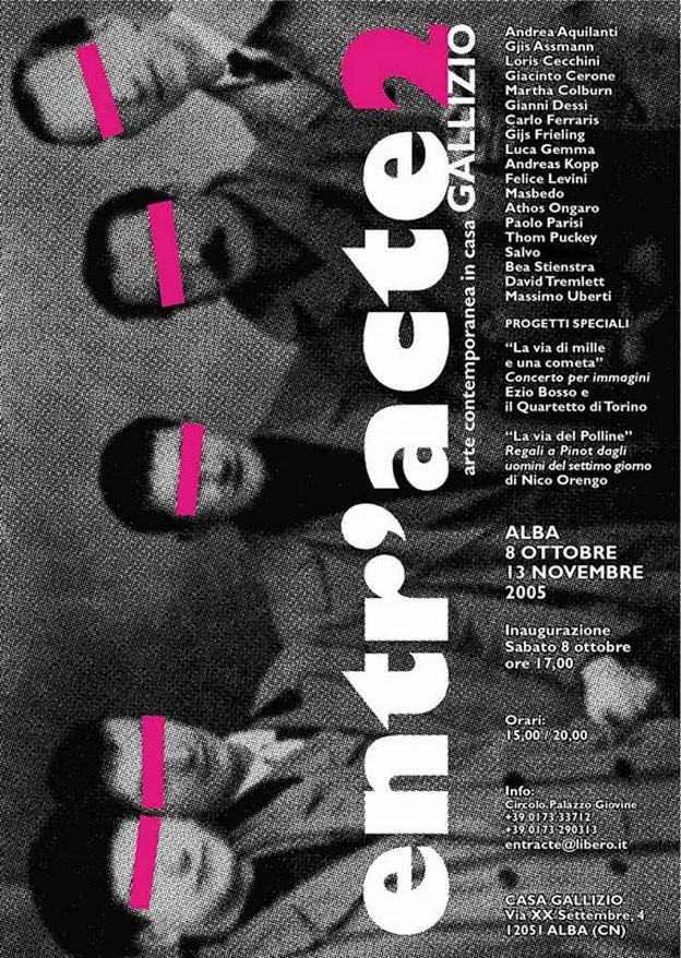 Entr’acte2 nasce dall’invito che Annamaria Gallizio, nipote dell’artista, ha fatto a Piercarlo Borgogno, anch’egli albese e già direttore artistico di Entr’acte nella sua prima edizione realizzata a Bologna in Palazzo Albiroli nel 2002, chiedendogli di pensare ad una mostra viva, speciale per questo speciale luogo ora, nel momento in cui si sta immaginando il destino dell’edificio. Da qui riecco il titolo della rassegna, preso a prestito dal noto film del 1924 del grande regista francese Renè Clair.