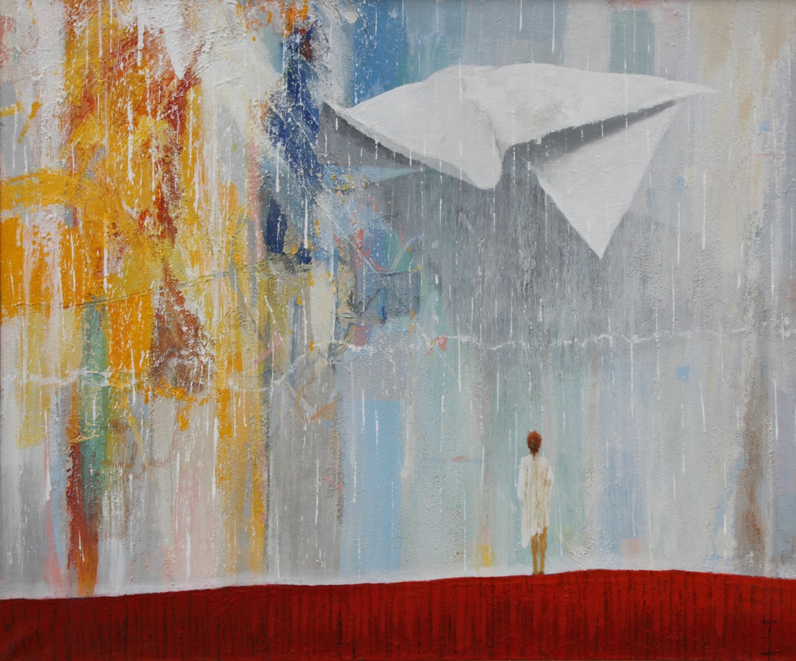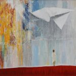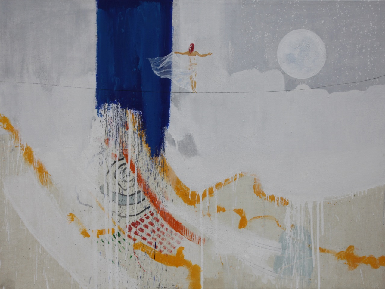 Allora l’aria è protagonista nel suo esistere e sfondo ad altre esistenze, tanto che donne e uomini, in queste opere sempre soli per non rubare spazio all’aria, o per esprimere la condizione dell’umano moderno, vanno verso una meta non precisata…procedono nell’aria. Ora muovendo da una terra infuocata, ora equilibristi mentre uno squarcio di blu ospita la luna muta e perlacea.