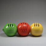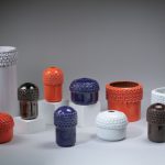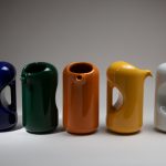 La mostra IL BATTITO DEL PICCHIO. Il fantastico mondo delle ceramiche di Enzo dà dunque spazio alla produzione ceramica di Bioli: lampade, fioriere, salvadanai, vasi, portacenere, tazze, piatti, tutti oggetti che rispondono a un linguaggio coerente e riconoscibile, fondato sulla componibilità e sulla modularità, e dunque pensati per dialogare tra loro più che per imporsi come pezzi isolati. Lo stile di Bioli guarda al futuro senza perdere il legame con la quotidianità: le sue forme “space age”, fatte di semisfere lucide, bocche circolari e basi troncoconiche, testimoniano l’interesse per un immaginario internazionale reinterpretato con grande naturalezza nei materiali ceramici. I gres e gli smalti pieni – arancione, blu oltremare, nero lucido – conferiscono agli oggetti una presenza intensa, capace di resistere nel tempo e di adattarsi tanto alla luce di una vetrina quanto all’atmosfera domestica di un salotto.