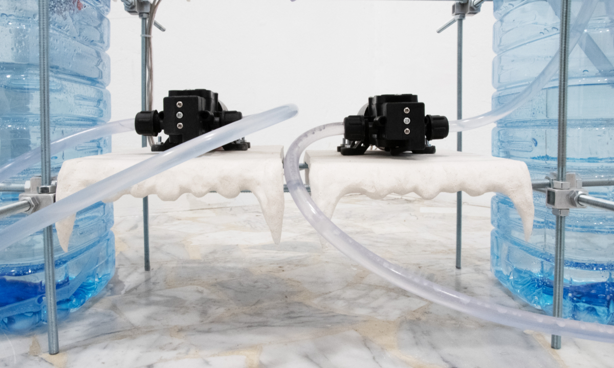 Il fulcro della mostra è l’installazione Depuratore 2, creata in collaborazione con Marco Selmin. Si tratta di un dispositivo automatizzato – ibrido tra elementi meccanici e organici – che simula un ciclo continuo di purificazione dei liquidi, evocando un processo reale di depurazione. L’opera nasce da una ricerca sull’inquinamento idrico causato da sostanze difficili da rimuovere, come PFAS, metalli pesanti, microplastiche e diserbanti, che resistono anche ai trattamenti più avanzati. Depuratore 2 invita così a interrogarsi sui limiti delle attuali tecnologie ambientali e sulle possibili forme di coesistenza e rigenerazione interspecie.