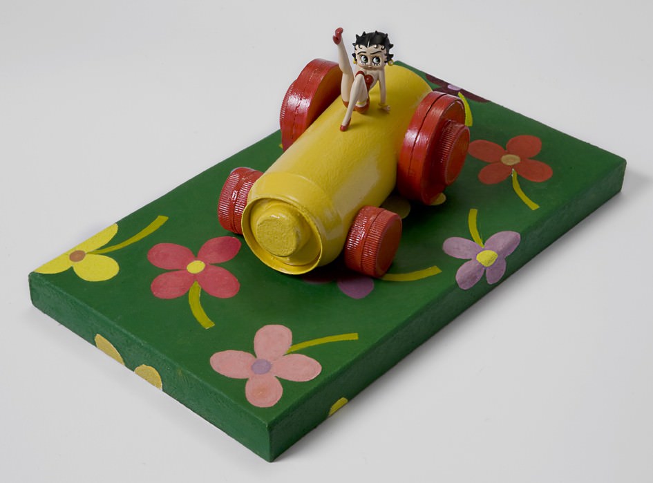A queste macchinine, costruite con materiale di recupero come lattine di birra, scatole di sigarette e fiammiferi, guarnizioni, tappi di bibite e vecchie matite, si affiancano figurine di procaci donnine manga, miniature di famose eroine dei fumetti e dei cartoni animati come la mitica Betty Boop. Sono perfette e maliziose incarnazioni della joie de vivre, divinità terrene, monumenti innalzati alla bellezza effimera, cui fanno eco i fiori, simboli della Vanitas, che sotto forma di delicati pattern e armoniose texture segnano i basamenti di questi altari postmoderni.
