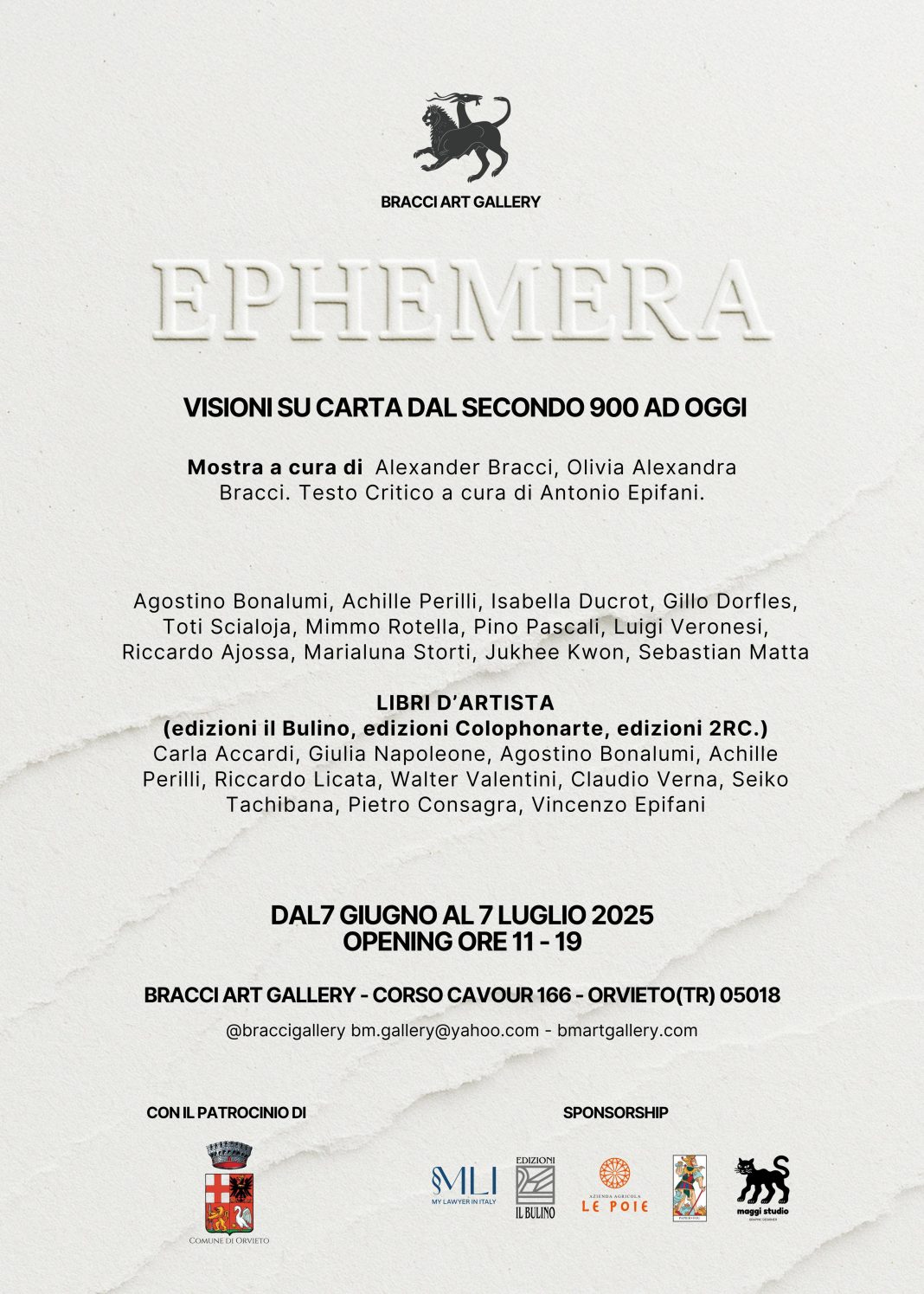 La mostra sarà aperta dal 7 giugno al 7 luglio 2025, presso la Bracci Gallery, Corso