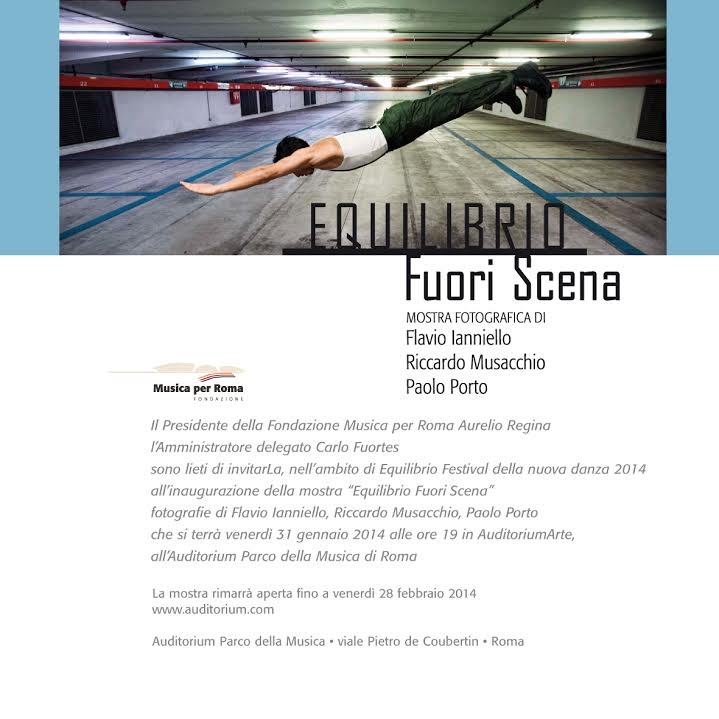 La mostra nasce da una collaborazione tra Riccardo Musacchio e Flavio Ianniello - fotografi dell'Auditorium - e un artista della fotografia di danza contemporanea, Paolo Porto. Il progetto si propone di trasferire fuori dal palco, ordinario luogo di rappresentazione, coreografie e improvvisazioni danzanti. Un'invasione al cuore di spazi vitali e spesso non accessibili dell'Auditorium. Agli interpreti dell'edizione del festival Equilibrio 2013 è stato proposto di scegliere la location del Parco della Musica che più si addicesse alla loro espressività. Il risultato è stato quello di produrre delle immagini di "figure danzanti" all'interno di un ascensore piuttosto che nei giardini della cavea, in bilico sui tubi innocenti delle scale antincendio, nel bar o addirittura nel sottotetto della sala Santa Cecilia. La mostra è composta da trenta stampe di grande (120x180) e medio formato (60x90) ma anche da foto-sequenze. Le foto saranno inoltre accompagnate da una clip video dal titolo
