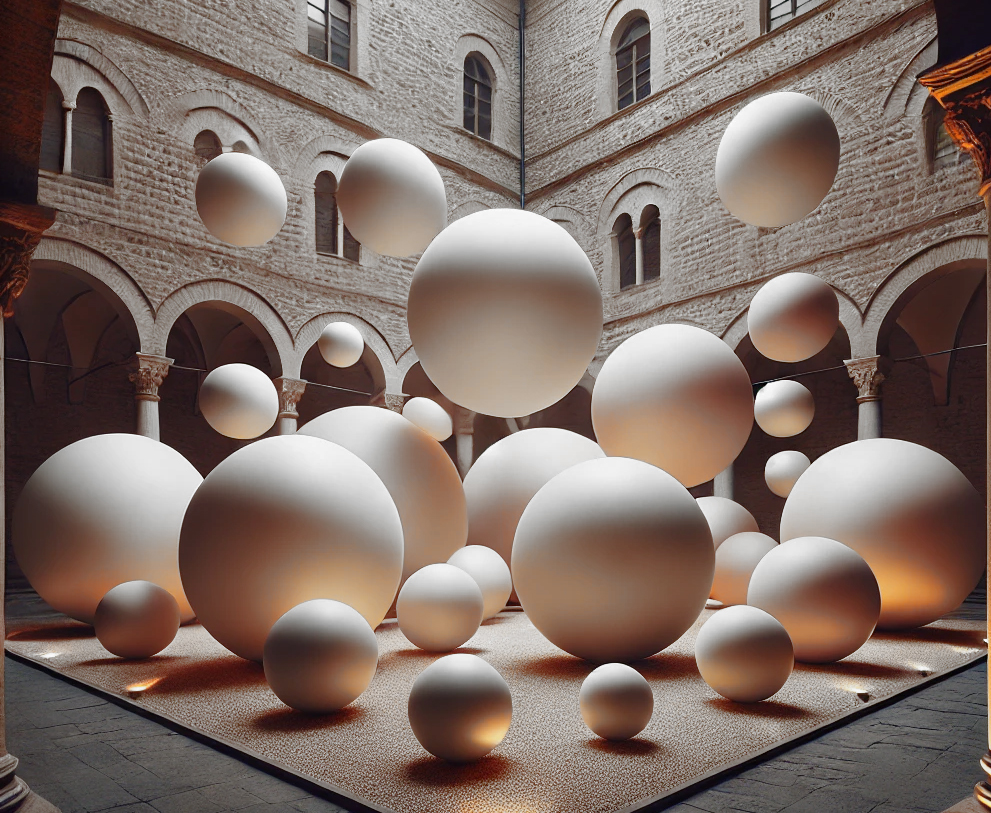 L’installazione si sviluppa nello spazio suggestivo di Palazzo Gualtiero, dove grandi sfere dalle forme, fluide e leggere, ci spingono oltre i portoni del palazzo, creando un dialogo visivo tra le severe architetture storiche e l’effimera loro delicatezza alcune sospese in alto verso il cielo tra i soffitti dei grandi corridoi e della corte interna ed altre adagiate a terra, invadono riempiendo con eleganza gli spazi dell’edificio.Il risultato è un’opera che coinvolge lo spettatore, trasmettendo un senso di equilibrio instabile, specchio della complessità del nostro tempo. Come le nostre esistenze, sospese tra opposti – pace e conflitto, stabilità e precarietà – le sfere si fanno simbolo della condizione umana, perennemente in bilico tra gravità e leggerezza, dubbio e certezza, menzogna e verità. La loro presenza, lungi dal fornire risposte definitive, invita a riflettere e pone interrogativi profondi: quale direzione stiamo prendendo? Quale futuro ci aspetta?
