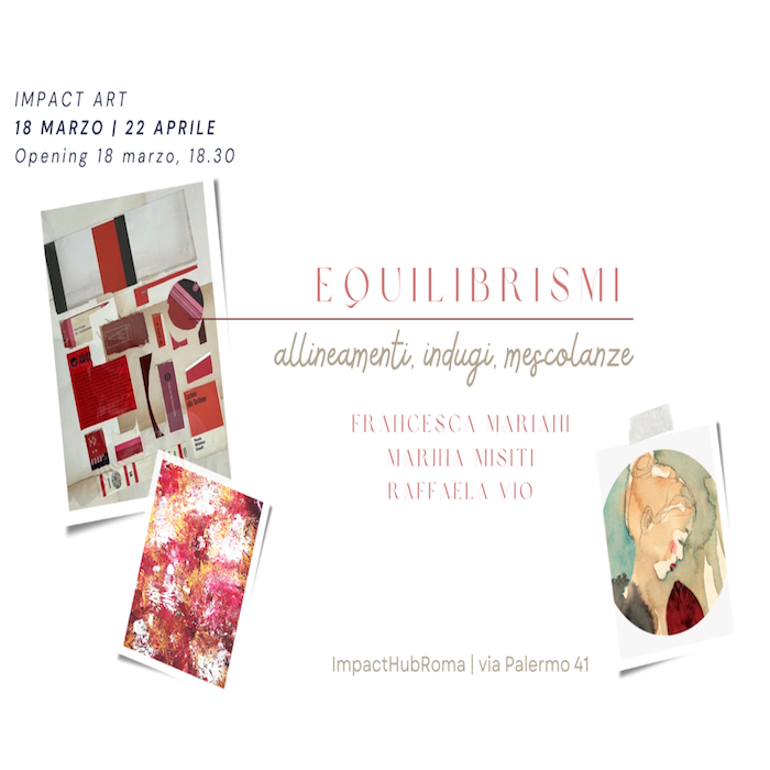 il nuovo progetto espositivo “Equilibrismi: allineamenti, indugi, mescolanze” inaugura venerdì 18 marzo alle 18.30 presso l’Impact Hub di via Palermo nel rione Monti al centro di Rom. L'opening sarà accompagnato da un dj set a partire dalle ore 21:00.