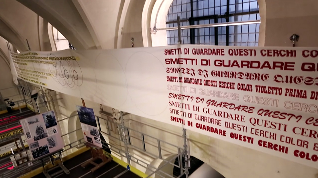 Eric Andersen ha ideato per lo spazio della Fondazione Mudima un percorso espositivo che ripercorre alcuni suoi lavori del recente passato, anche legati alla vicenda espositiva della Fondazione e al suo storico impegno sul gruppo Fluxus. Le opere in mostra offrono al pubblico un’esperienza interattiva e coinvolgente che abbraccia video, installazione, performance, silk-screens e floor-drawings. I video “Achilleus”, “The Sunlawn”, “Marianne (Artificial Stars)” accompagnano il visitatore tra nuovi pianeti da costruire e stelle artificiali, lungo un percorso che si articola intorno a diverse installazioni: “The Banner”, la più lunga serigrafia mai realizzata (50 metri) che sfida l’osservatore a cercare di non guardarla mai, la riattualizzazione della performance “Achilleus”, ideata per la mostra Ubi Fluxus Ibi Motus a cura di Achille Bonito Oliva a Venezia nel 1990 e infine “Please Leave”, una nuova forma di danza le cui istruzioni sono scritte su tutto il pavimento della Fondazione.