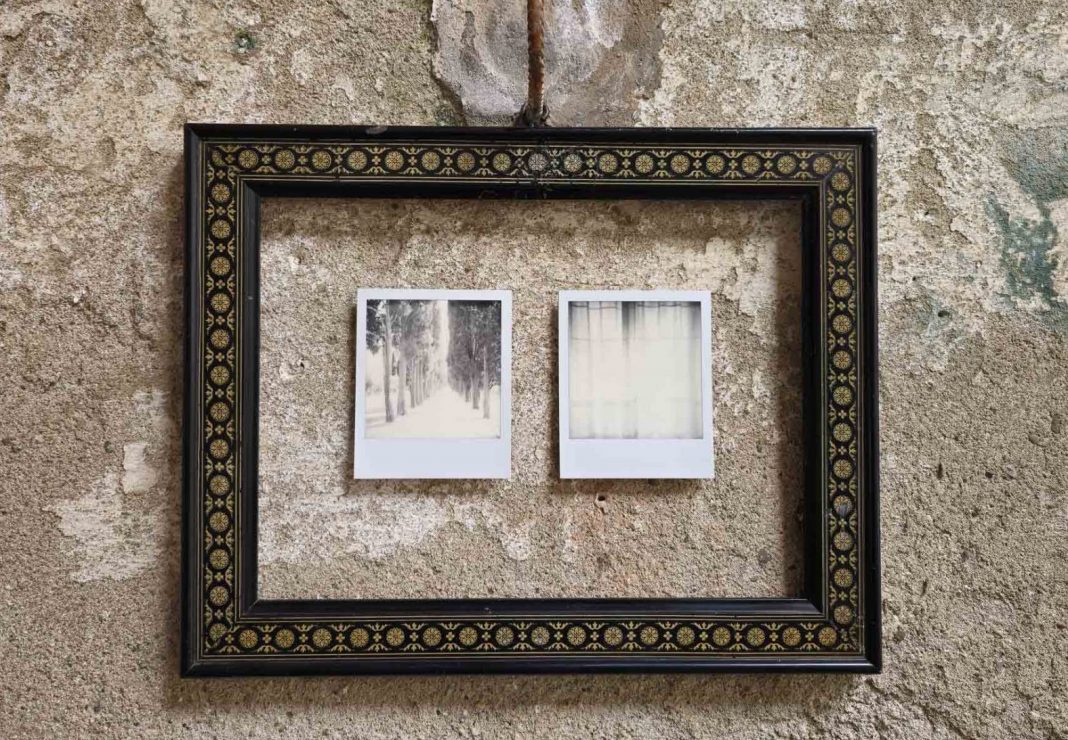 Da queste premesse la restituzione dell’artista è una coerente scelta di mezzi espressivi a lui cari, l’uso fotografico, installazioni neon, pitture, cianotipie, dorature. Utilizzo di antiche polaroid, recupero di elementi naturali raccolti nel bosco o di sentimentali oggetti abbandonati e da lui prelevati dagli ambienti appartati o vissuti dalla famiglia Rospigliosi che qui abita : tv grammofoni radio cornici chiavi.