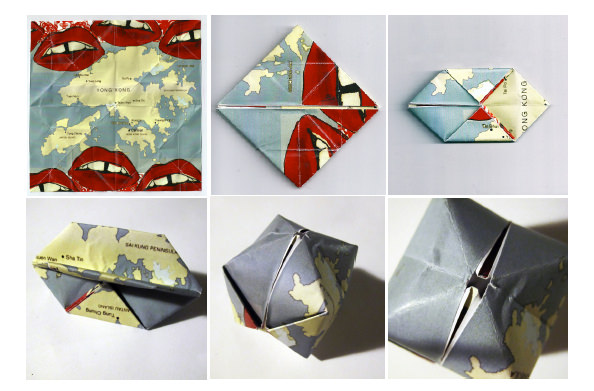 Erica Battello ripropone e affianca la cultura occidentale con quella orientale con la serie Peekaboo, origami decorati da mappe, all’interno dei quali con l’ausilio di una lente è possibile osservare attraverso la fessura dell’opera, soffiando su di essa, la foto di un suo parente lontano.