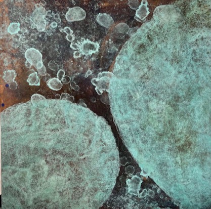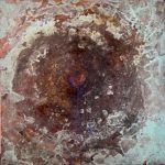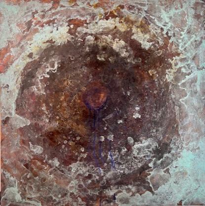 Quadri/scultura in rame, frutto di un processo di ossidazione con l’uso di reagenti e il fuoco, processo, che attinge a tecniche antiche di patinatura a caldo dei metalli. La trasformazione del tempo e della mano dell’uomo sulla materia a confronto con le trasformazioni del luogo che ci accoglie.