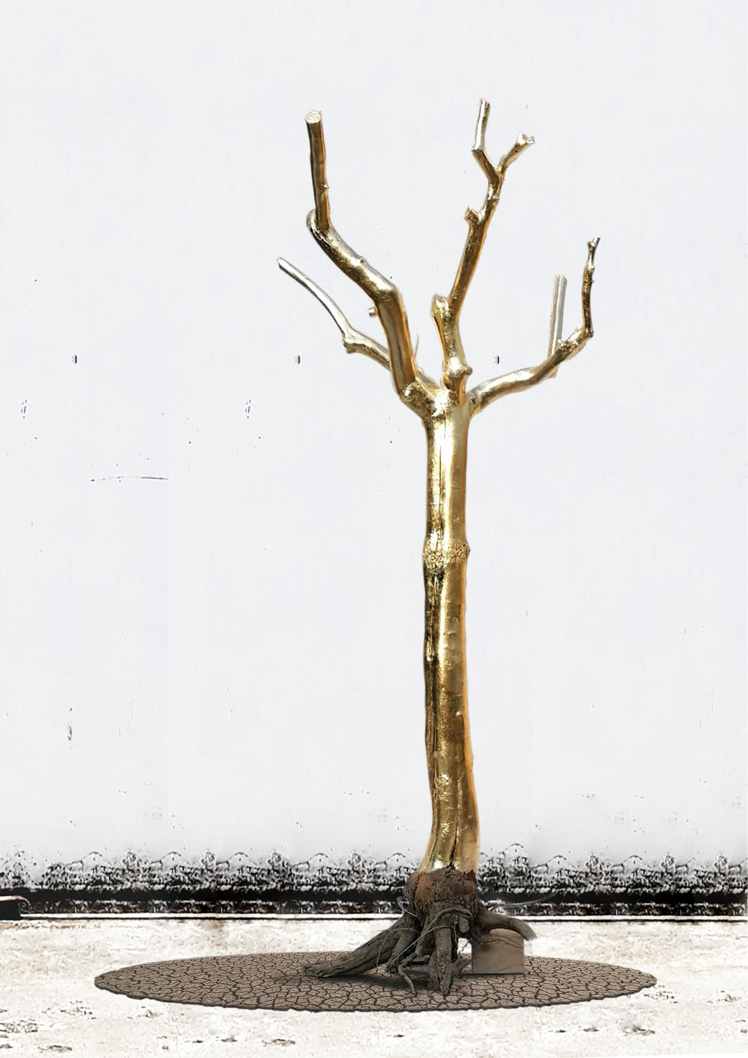 All’approccio pittorico di Morales si affianca la matericità di Anna Turina che, invece, indaga l’aspetto terrestre. Un albero rivestito di foglia oro si erge nello spazio espositivo: il gesto dell’artista lo rende immortale, lo trasforma in simbolo che trova nella sua trasformazione il significato del cambiamento. Turina riflette sulle conseguenze che un atto improvviso – il crollo di un albero, la corteccia bruciata da un fulmine, la caduta di un nido- possono determinare nel ciclo della vita. Piccole metamorfosi simbolo della fragilità ma anche della sua forza e della sua eterna trasformazione.