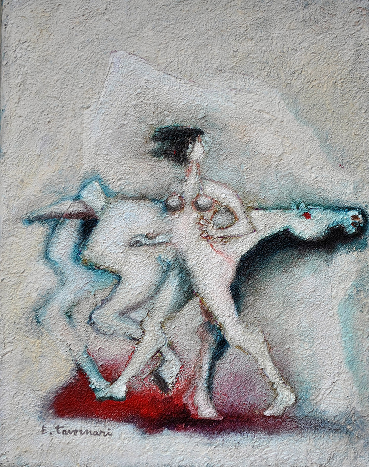“Penso al mite sorriso, alla conversazione sussurrata di Ernesto Tavernari, recupero le sue immagini, i suoi colori, e sono tentato da una affettuosa correzione, non homo ma puer avus ludens, dentro uno scenario di sogni, invenzioni, affabulazioni.