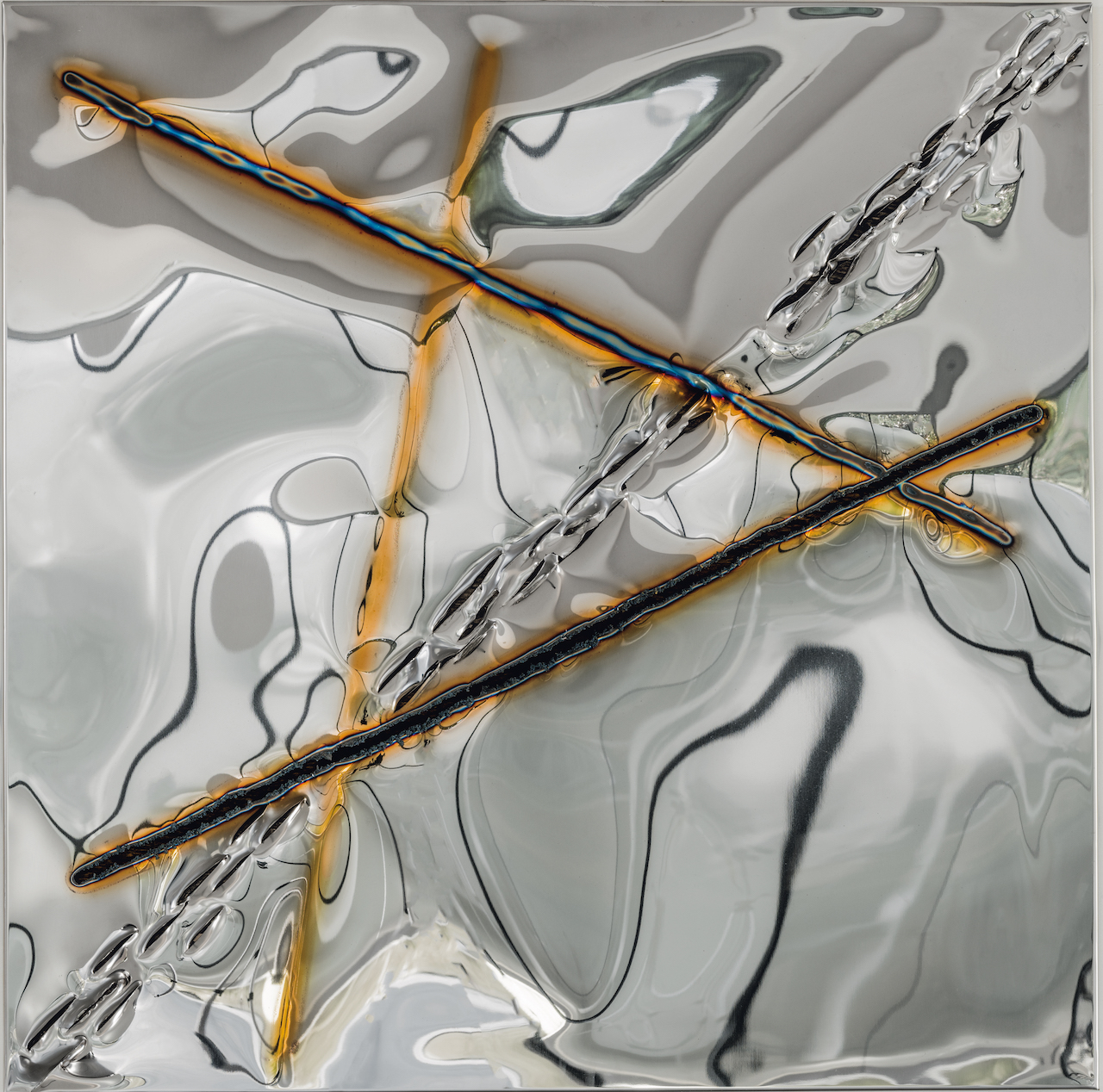 In mostra si assiste alla metamorfosi degli elementi impiegati attraverso cicli di lavori che vanno dalle delicate Stesure in cemento, in cui il segno affiora o sprofonda con delicata fisicità, alle più marcate Cronotopografie su carta per confluire poi – punto centrale della mostra – alla potente tangibilità delle Vanitas Cronotopografie dei celeberrimi acciai “scritti” con la fiamma ossidrica.