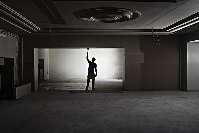Eros Mauroner ha fotografato le varie fasi dei lavori di restauro e riqualificazione dei locali della Stazione Centrale di Milano, un tempo ex-deposito bagagli di prima classe, in occasione dell’apertura di un nuovo punto vendita Saturn. Ogni fotografia possiede una singolare forza espressiva, la suggestione dello sforzo, fisico e progettuale diviene tangibile grazie anche alla particolare complessità e luminosità dell’ambiente “cantiere”.