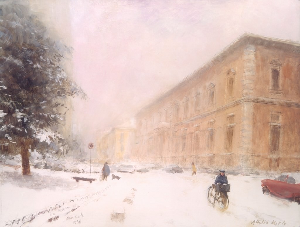 Ciò che per lui è l’identità plastica del corporeo, è per Melo la luce nella visione. La sua rosa di riferimenti è sicura, risiede tutta - tra le filigrane del grande luminismo veneziano che in lui è, verrebbe da dire, retaggio di sangue - nel paesismo tra Ottocento e Novecento, in un vero di natura che si fa fasto luminoso, pulsazione poetica che dalle cose non trascorre, ma ne è lievito e spirito: vogliamo dire, per intenderci, un Longoni, un Reycend, un Carcano e, perché no, un Tosi? Anche Melo assetta la propria personalità entro perimetri sicuri di genere, il ritratto, il paesaggio. Ma par distillarne qualcosa d’altro, rispetto alla mera adesione a protocolli di modo. E’ la luce che intride, appena offuscata dalle ombre prime, la neve su Brera, o il baluginare d’Oriente nelle cose veneziane, dai fremiti guardeschi ma di salda, immediata, sensuosa partecipazione al dato visivo. Come Pellini nei recinti sicuri della plastica di corpo, così Melo non avverte la necessità di épater, di porre in discussione l’apparato dei codici. E’ il miracolo della luce ad attrarlo, quel mutare che è stato d’animo e non fisiologia percettiva, quel sentimento delle cose che ha il coraggio di non ammantarsi d’altro che del proprio ridarsi fragrante, posa dopo posa.
