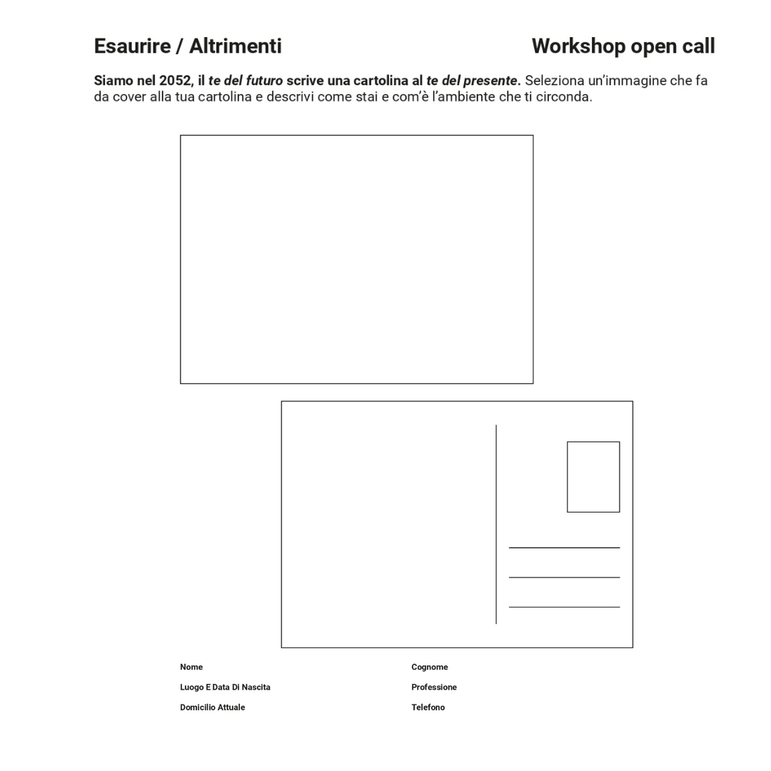 Per partecipare al workshop compilare il form e inviarlo entro il 12 settembre a campobase18@gmail.com mettendo in oggetto “ESAURIRE/ALTRIMENTI”.