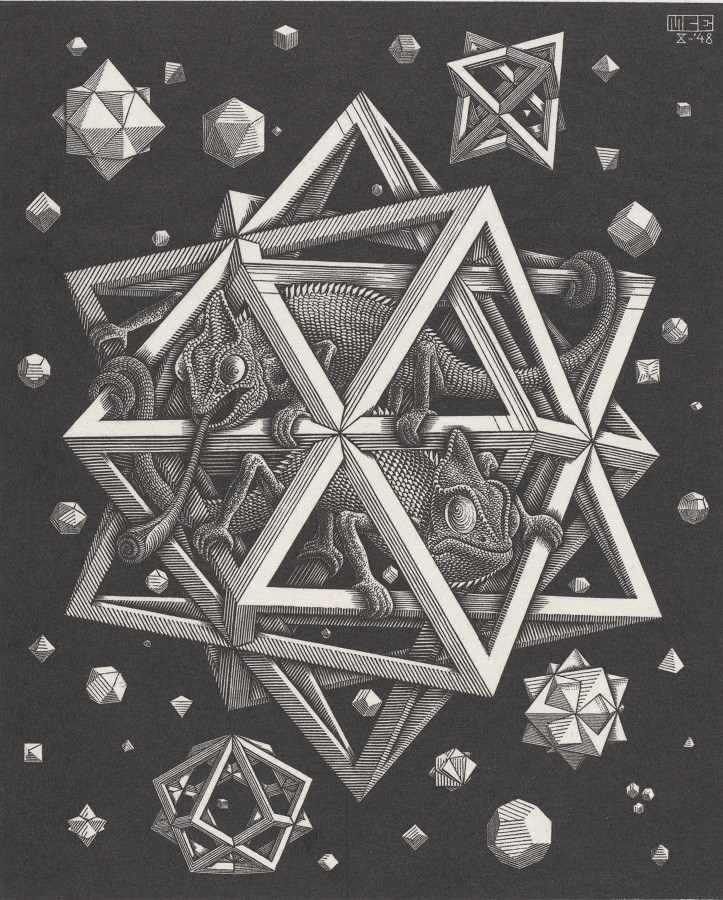 Pur rimanendo a lungo un attento interprete del paesaggio, Escher esplora sempre più a fondo gli orizzonti dell’illusione visiva, attraverso composizioni di carattere geometrico o con la creazione di architetture “impossibili”.