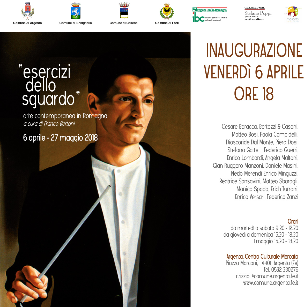 “Esercizi dello sguardo. Arte contemporanea in Romagna” è una mostra, in quattro sedi (Argenta, Brisighella, Forlì e Cesena) dedicata all’arte figurativa contemporanea in Romagna. Sono stati invitati a partecipare 42 artisti che presentano ciascuno 3 opere, per un totale di 126 lavori.