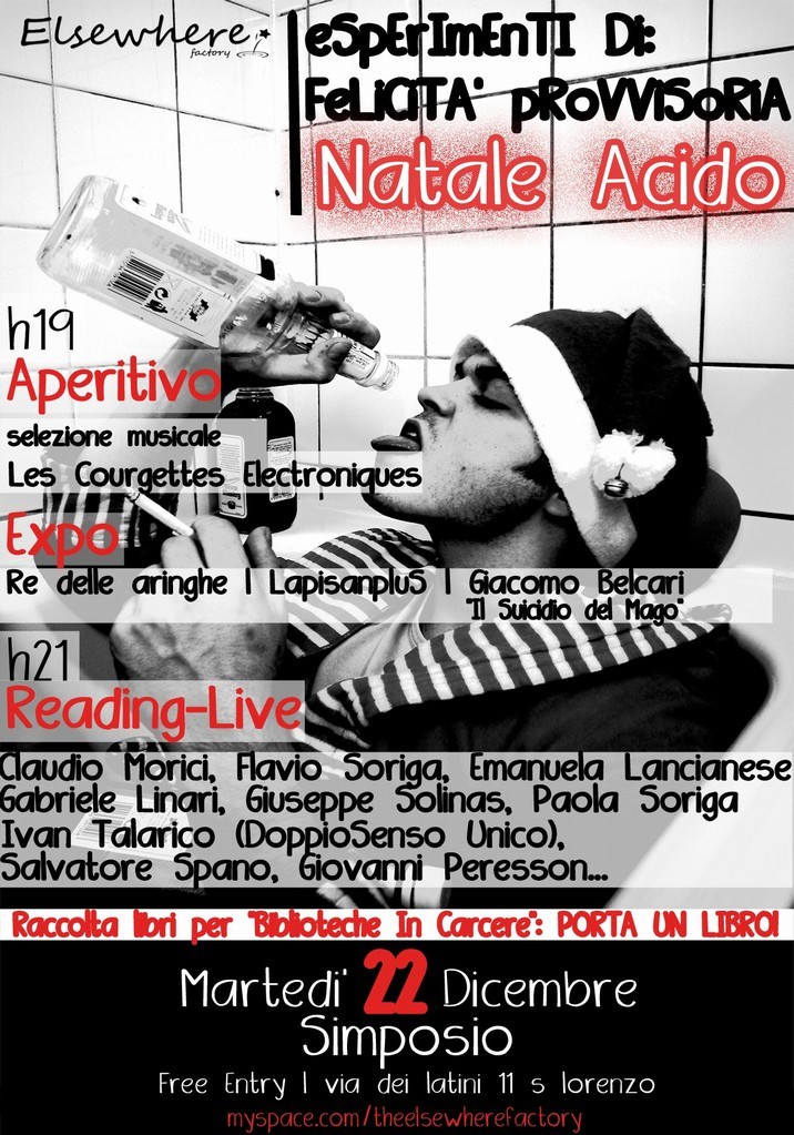 NATALE ACIDO è il tema del secondo appuntamento con gli ESPERIMENTI DI FELICITA' PROVVISORIA, progetto a cura del collettivo artistico ELSEWHERE FACTORY dedicato a reading di scrittori affermati ed emergenti,