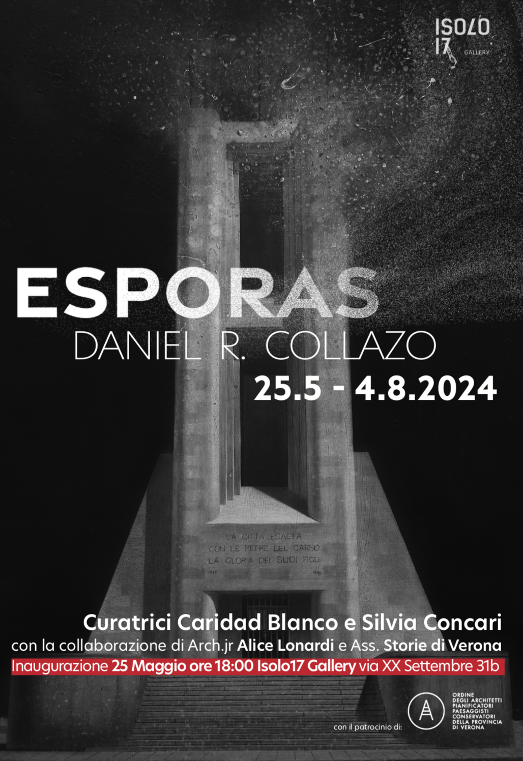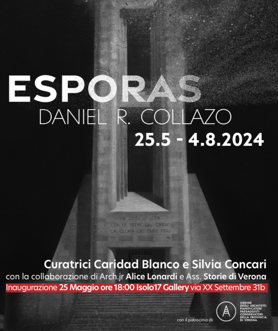 Dal 25 maggio negli spazi della galleria sarà visitabile Esporas: questo il titolo scelto per la mostra frutto della ricerca di Daniel R.Collazo che dà spazio sia ad opere di repertorio, che inedite e site specific, con l’obiettivo di indagare a fondo la tematica dell’architettura razionalista.