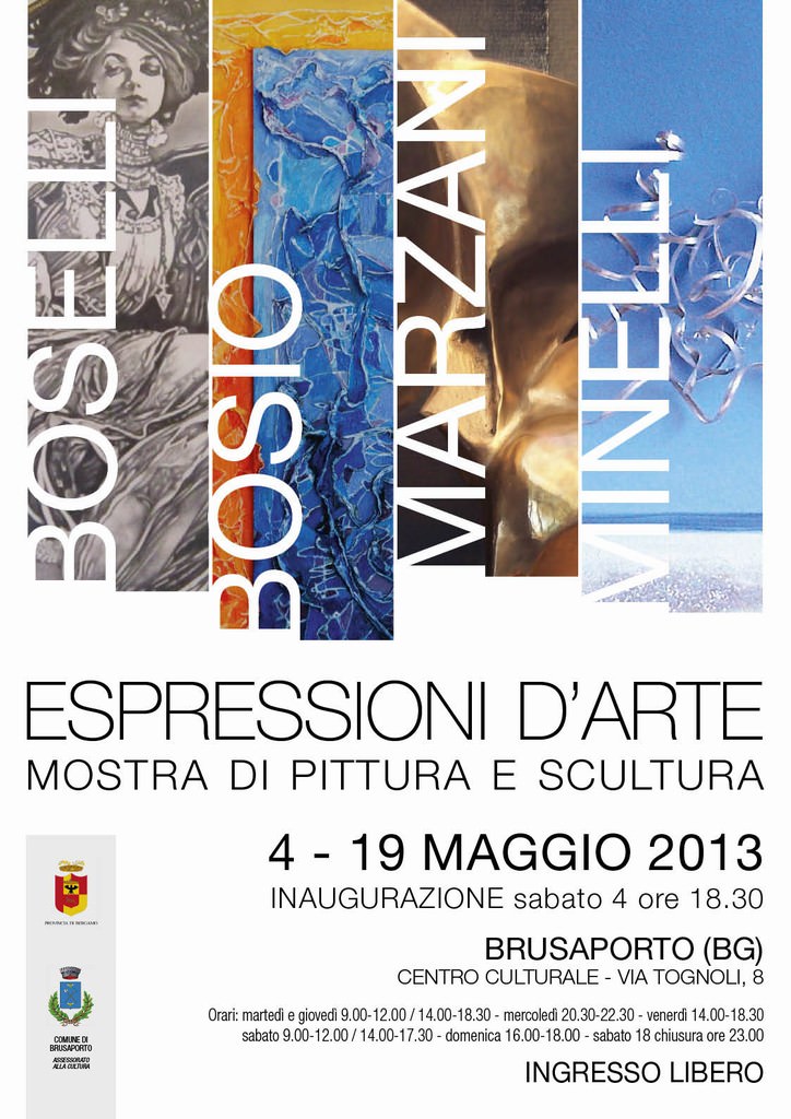 Inaugura sabato 4 maggio alle ore 18.30 presso il Centro Culturale di Brusaporto (Via Tognoli n.8) la mostra di pittura e scultura di Margherita Bosio, Liliana Minelli, Alessandra Boselli e Severino Marzani: un viaggio tra colori ad olio, acciaio, tessuti, matita, foglia d’oro e bronzo che desidera rappresentare le varie forme di espressione dell’arte.
