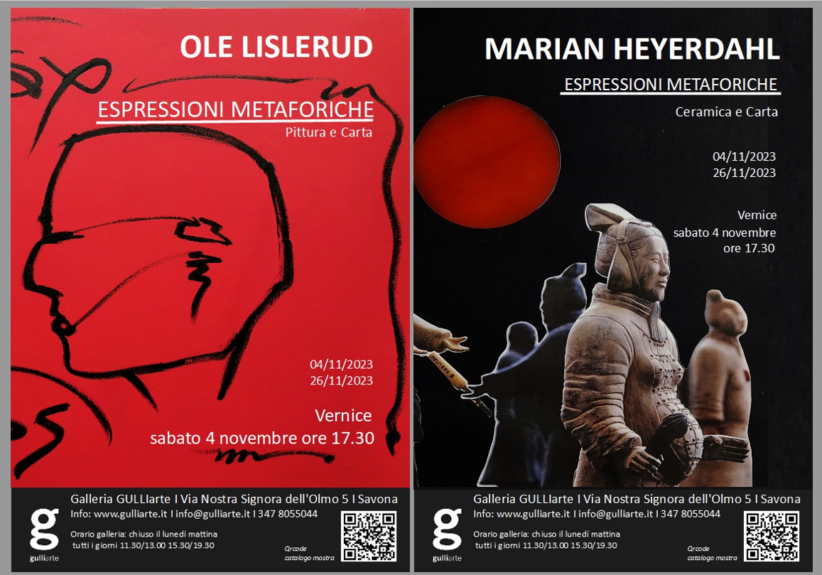 Mostra di pittura, ceramica e carta. Ole Lislerud e Marian Heyerdahl sono artisti di nazionalitá Norvegese, di grande esperienza internazionale, raffinata cultura e provate capacita’. Entrambi si sono confrontati con culture di genti e paesi diversi, conducendo esperienze lavorative in varie parti