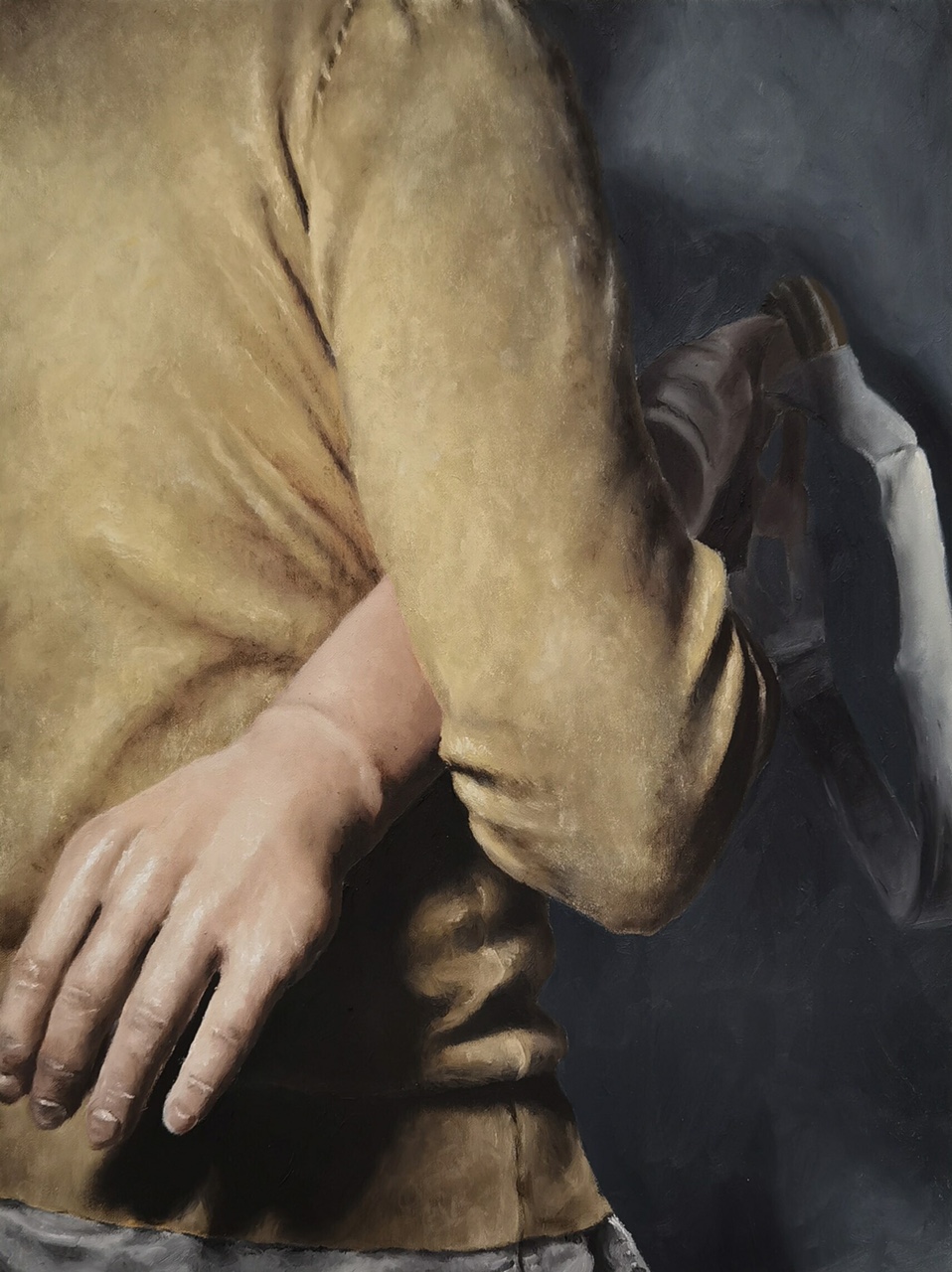 Una visione personale del corpo, monumentale e dai richiami classici, che si esprime a modo suo con la propria identità interagendo con lo spazio circostante. La monumentalità del soggetto raffigurato assorbe e priva di dettagli lo sfondo, che, quasi soffocato, funge da teatro perfetto per la figura irraggiungibile che esprime sé stessa recitando il proprio linguaggio di posa.