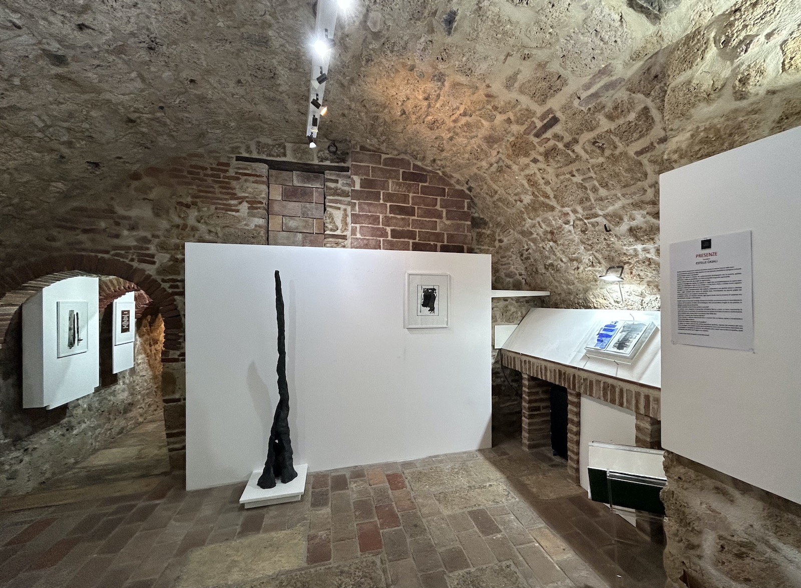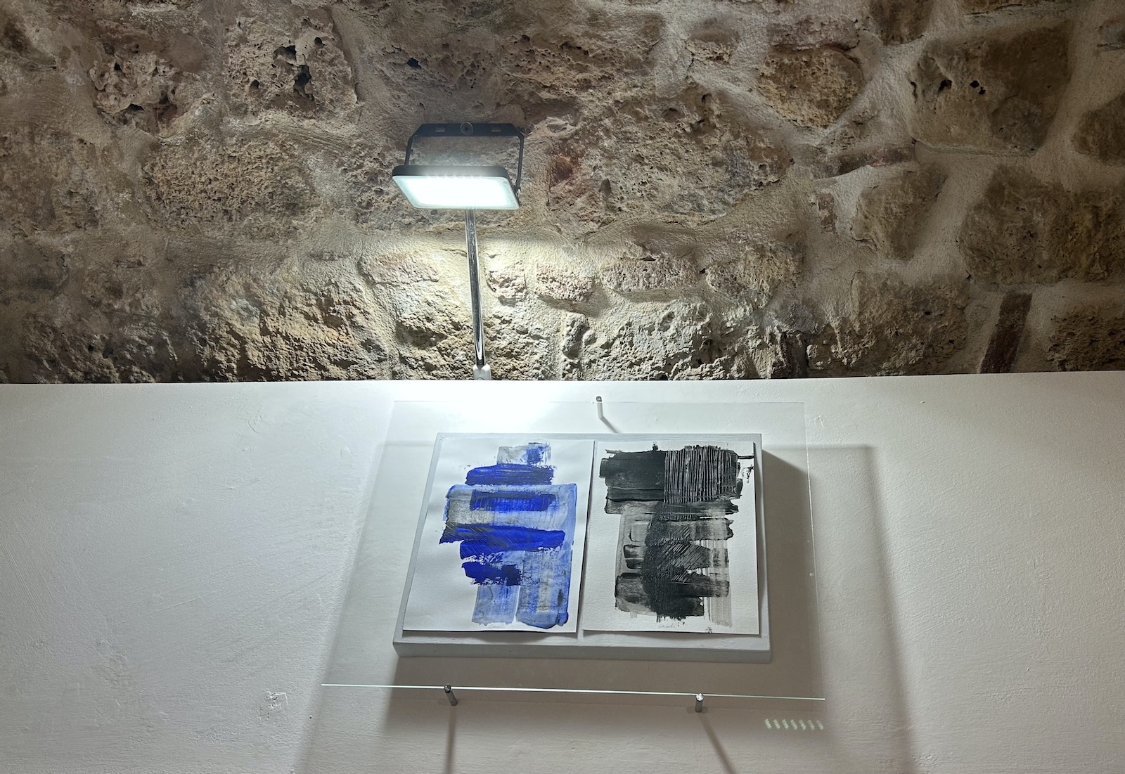 Le opere su carta, complementari alla scultura, presentano una grafica veloce e istintiva dove i segni verticali sono carichi di materia nera, frammentata da piccole griglie del medesimo colore o con supporti cromatici blu.