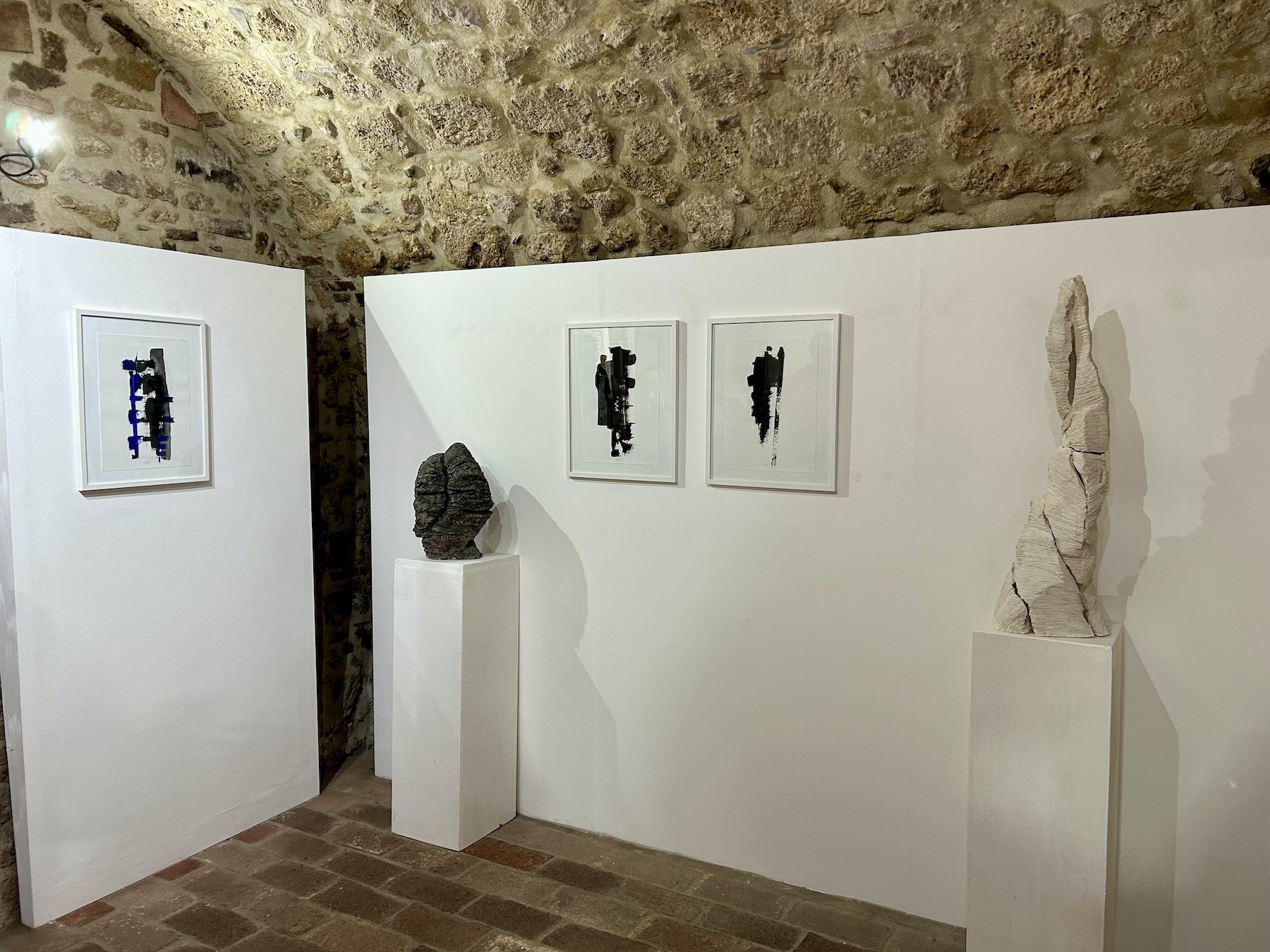 Le opere in mostra sono le mie prime espressioni grafiche, ispirata dal maestro del nero Pierre Soulages. Ho iniziato questa sperimentazione come una nuova forma espressiva che accompagna e completa la scultura. Ho utilizzato solo i colori nero e blu e la grafite, quasi scolpendo sulla carta con il segno e la materia.