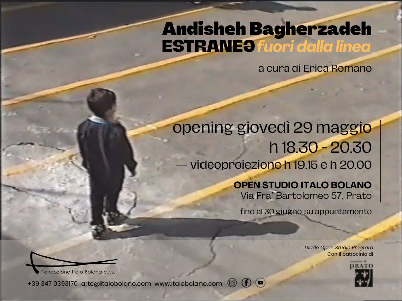 Giovedì 29 maggio alle ore 18.30 presso l’Open Studio Italo Bolano (via Fra’ Bartolomeo 57, Prato) verrà inaugurata ESTRANEɘ. Fuori dalla linea, personale di Andisheh Bagherzadeh (Tehran, 1993), a cura di Erica Romano, direttrice artistica della Fondazione Italo Bolano, parte di Diade Open Studio Program con il patrocinio del Comune di Prato. La mostra è il primo appuntamento di un progetto espositivo più ampio, che proseguirà in estate all’Open Air Museum all’Isola d’Elba, e presenta una video-installazione programmatica del lavoro