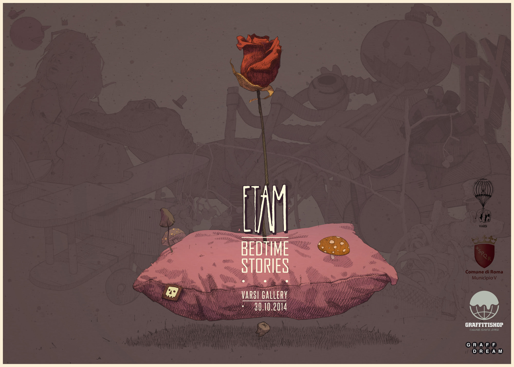 Il mondo incantato degli Etam Cru, attraversa lo spazio della galleria Varsi, con Bedtimes stories, la loro prima personale in Italia, curata da Marta Gargiulo.