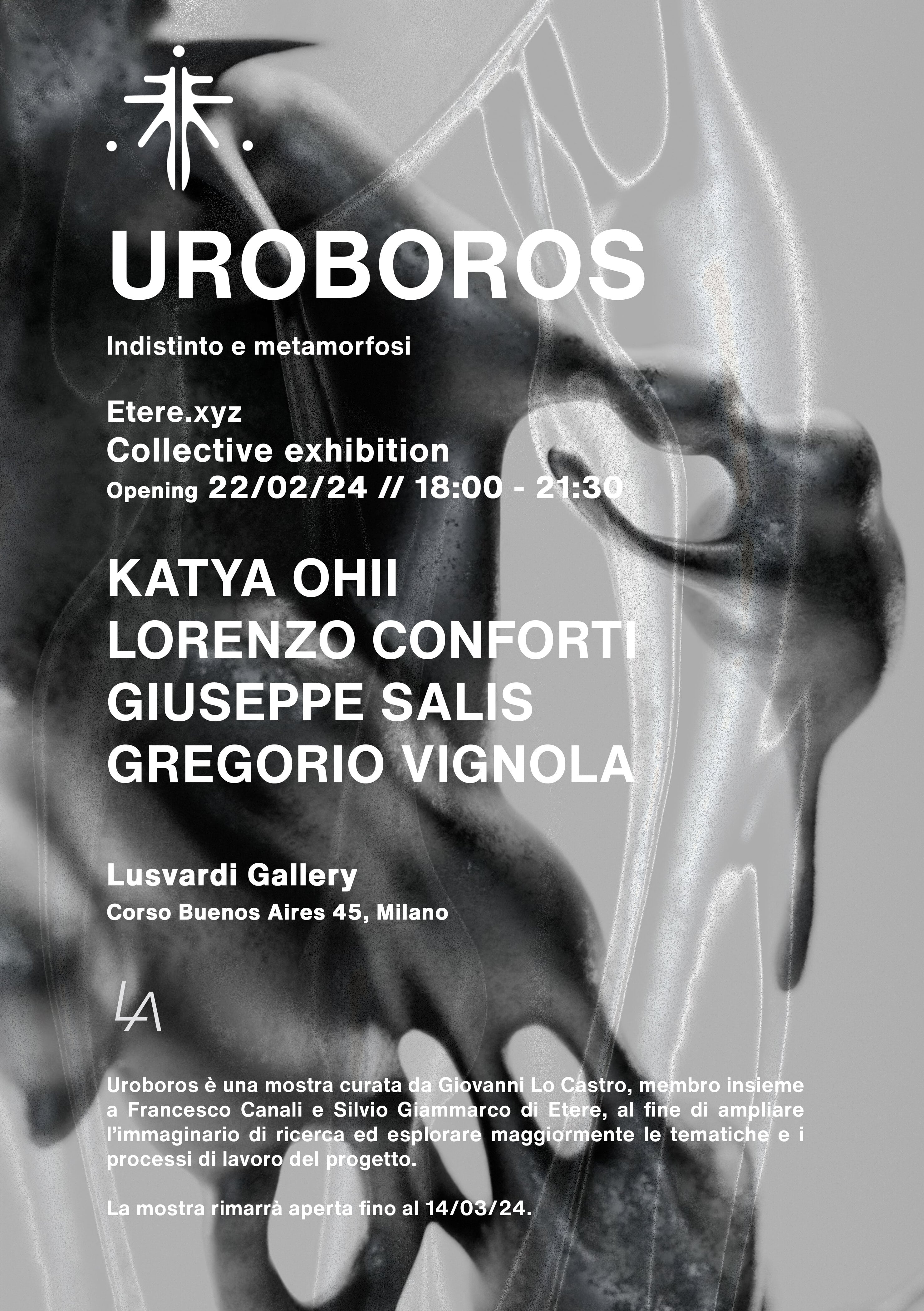 Lusvardi Art ospita "Uroboros" mostra curata da Giovanni Lo Castro, membro insieme a Francesco Canali e Silvio Giammarco di Etere, al fine di ampliare l’immaginario di ricerca ed esplorare maggiormente le tematiche e i processi di lavoro del progetto.