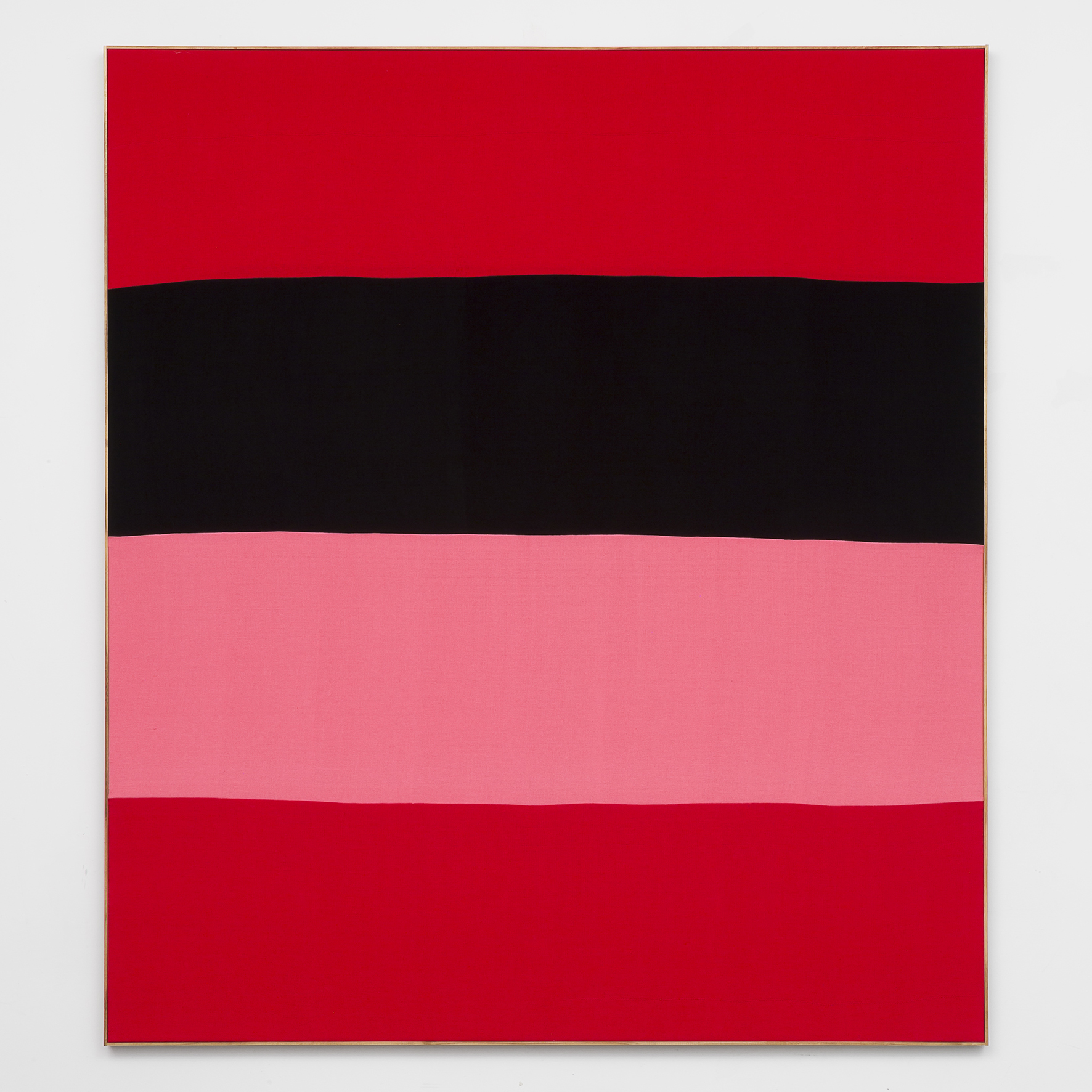 L'artista americano Ethan Cook fa il suo ritorno in galleria con un nuovo progetto intitolato 'Bande', che presenta una serie di lavori più recenti che segnano un’evoluzione nella sua produzione artistica degli ultimi anni. Le tele in cotone tessute a mano, costituite da ampie e ripetute strisce orizzontali di colori cuciti tra loro, popolano le pareti della galleria, mostrando una palette variegata di rossi e arancioni vibranti, di rosa e verdi, fino al blu più profondo, al marrone e al nero più scuro.