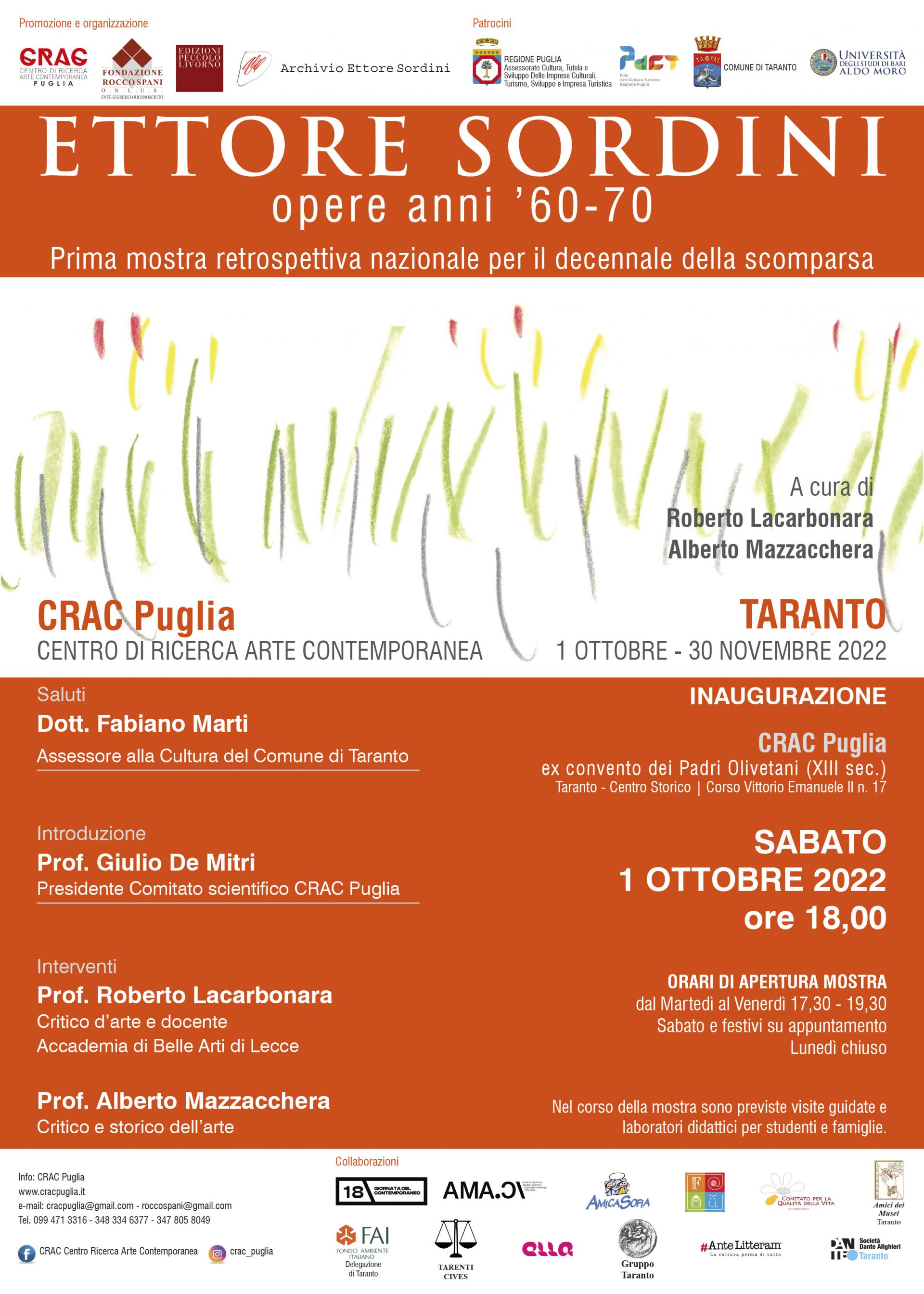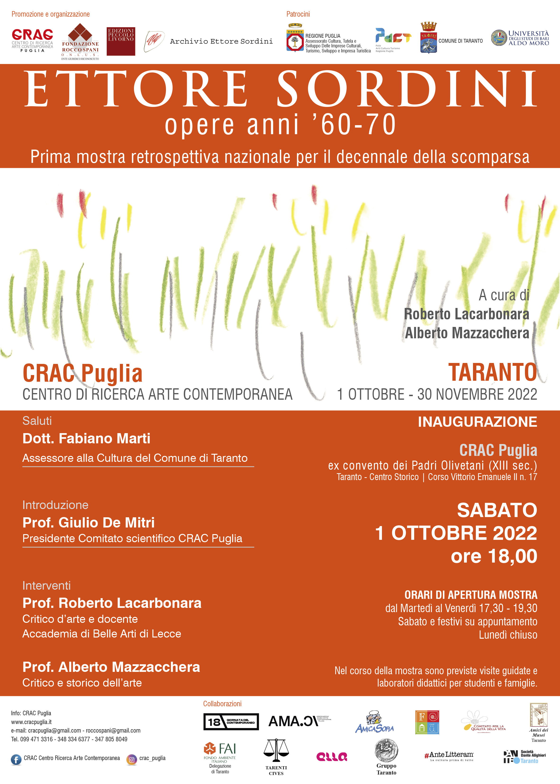Sabato 1 ottobre p.v. alle ore 18.00 al CRAC Puglia (Centro di Ricerca Arte Contemporanea) della Fondazione Rocco Spani Onlus avrà luogo l'inaugurazione della mostra retrospettiva del celebre maestro Ettore Sordini (Milano, 1934 – Fossombrone, 2012) a cura di Roberto Lacarbonara e Alberto Mazzacchera.
