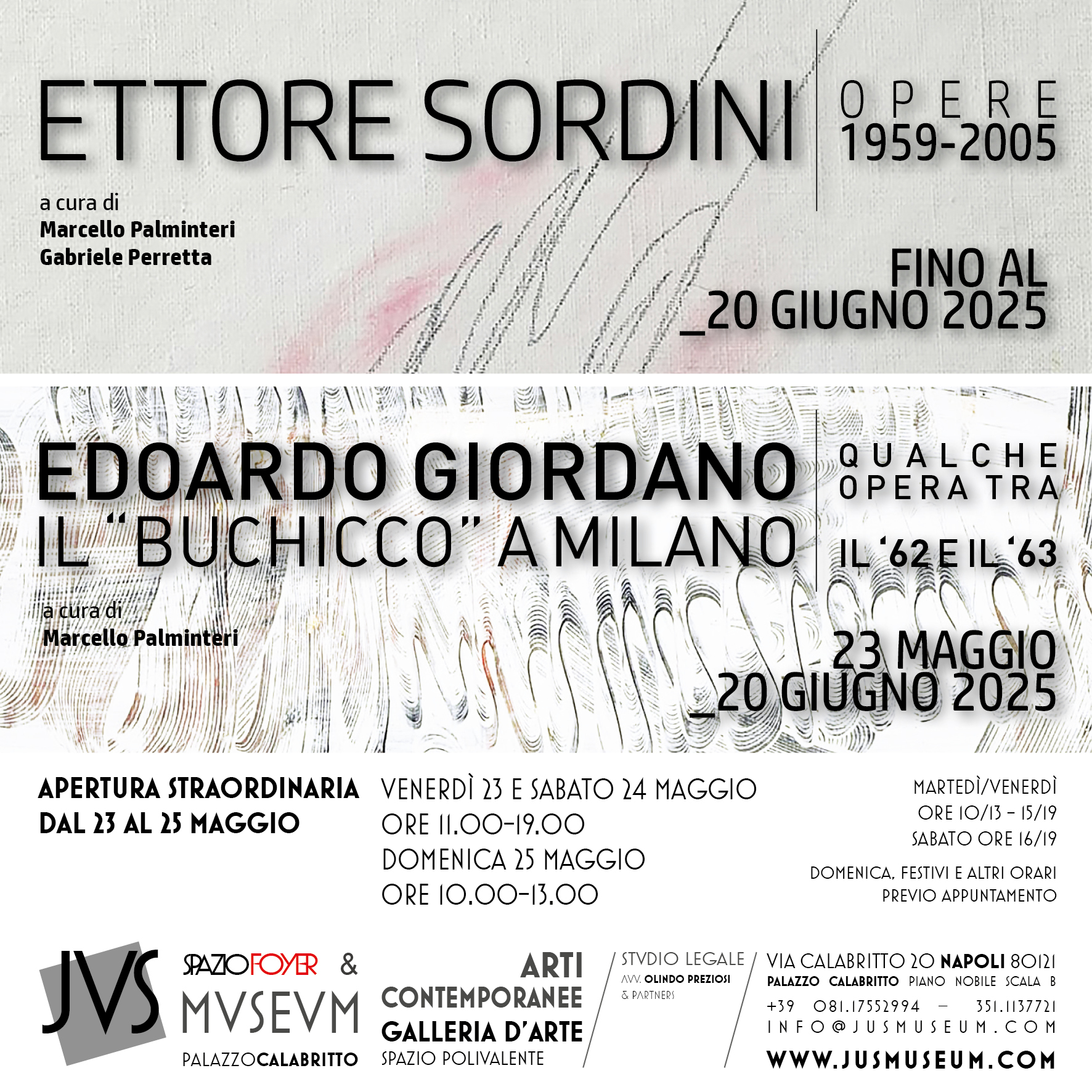 NAPOLI. Fino al 20 giugno 2025, presso lo JUS Museum | Galleria d’Arte di Napoli (Palazzo Calabritto, Via Calabritto, 20, piano nobile, scala B) è in corso la mostra “Ettore Sordini. Opere 1959-2005” a cura di Marcello Palminteri e Gabriele Perretta.