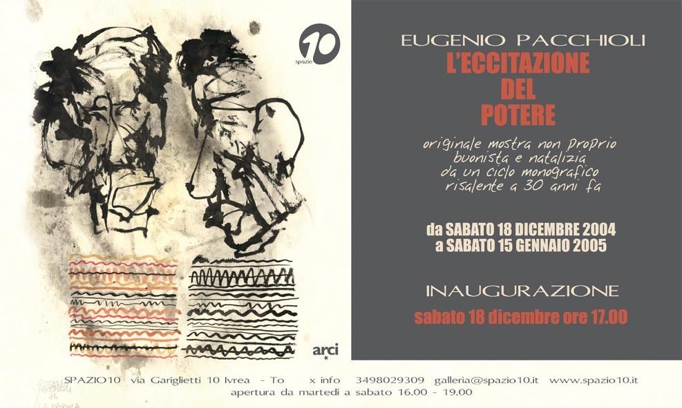 L’intero ciclo composto di 31 lavori a china su carta ha come titolo, l’eccitazione del potere e si inserisce nella continua ed originale programmazione espositiva di Spazio10 che ha rilevato in questi lavori, al di là della stagione in cui furono realizzati, una permanente validità dei contenuti oltre il filo antico dello stile grafico dell’autore.