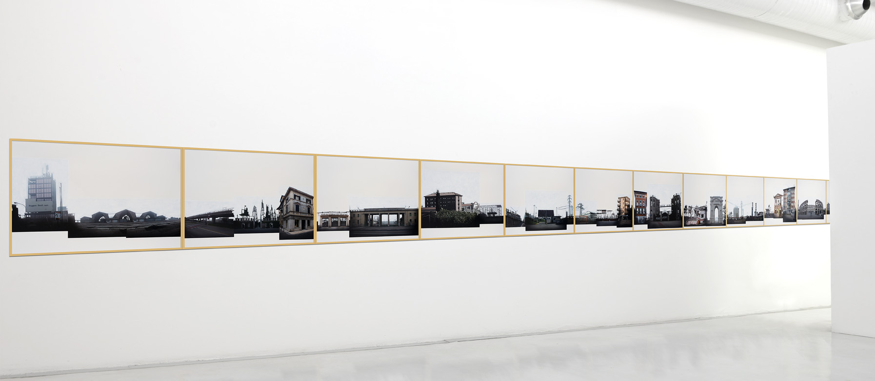 Ecco allora, tra le opere esposte, l’orizzonte urbano di "Verona Landscape", imponente lavoro nel suo sviluppo lineare oltre 30 metri di lunghezza dove compaiono dipinti edifici trasfigurati e sospesi, isolati e ricontestualizzati, tra reale ed irreale. "Untitled 01", installazione composta da due giradischi che riprodurranno un brano musicale su vinile, appositamente scritto da Eugenio Tibaldi, libera interpretazione delle vicende shakespeariane di Romeo e Giulietta. Sul lato a, nell’adattamento lirico interpretato da un cantante del Conservatorio di Verona, sul lato b, nella versione di una ballata interpretata da un duo di musicisti rumeni. La riflessione sull’identità personale e sociale passa anche attraverso il gioco di finzione e dello stereotipo, nella rappresentazione del labile confine tra reale ed immaginario declinato nell' installazione "Maps", ventiquattro opere realizzate con materiali industriali, imitazioni della tipica pietra marmo rosso di Verona, con la descrizione del perimetro urbano di tutte le altre città dal nome Verona sparse nel mondo.