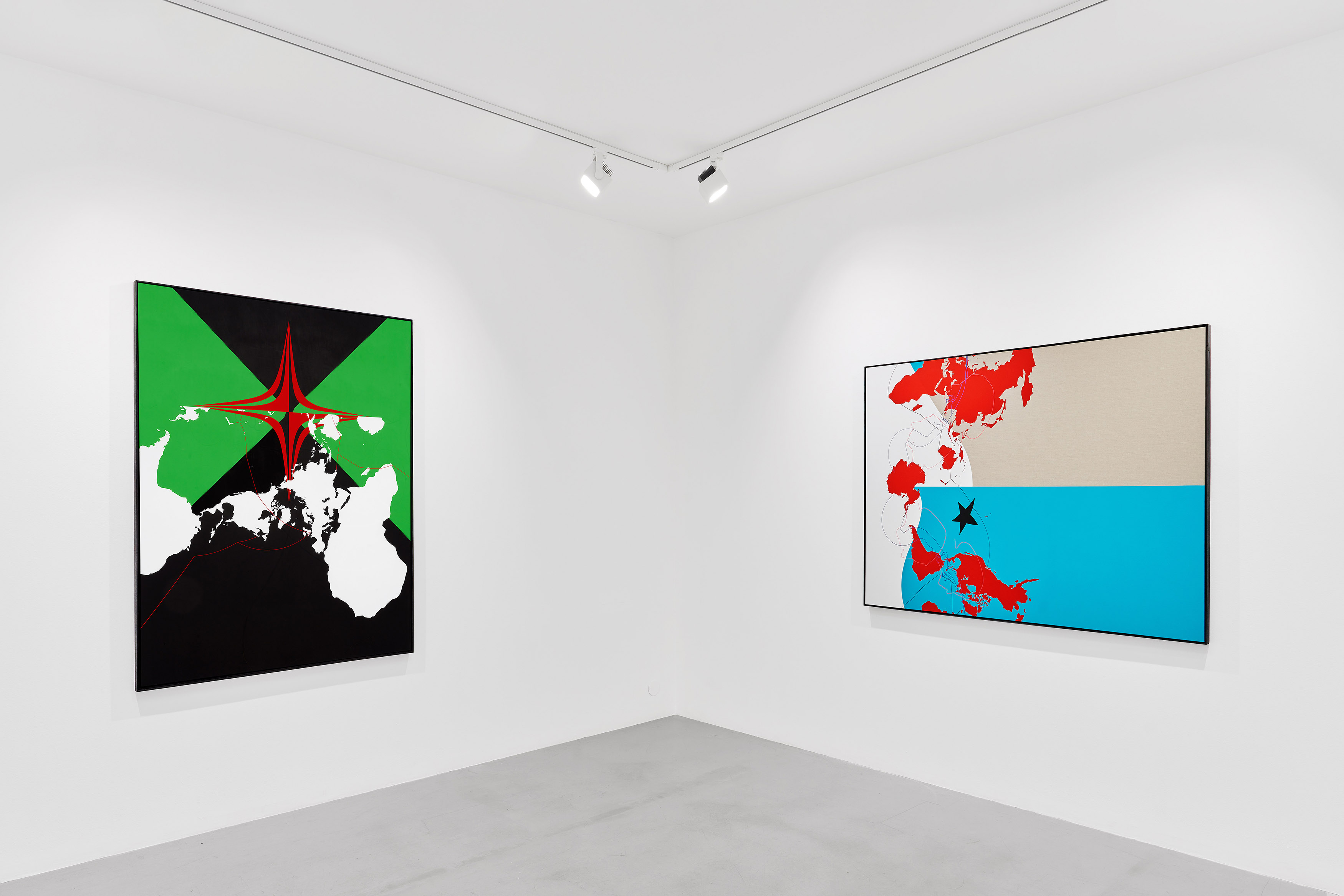 Il senso di deformazione storicizzata delle realtà che l’opera mette in luce è presente e stratificato anche nei sistemi digitali che utilizziamo quotidianamente. A collegare la scultura di “…” ai dipinti di Strands un’enorme stampa che copre tutto il pavimento anch’essa realizzata col software worldinfigures.
