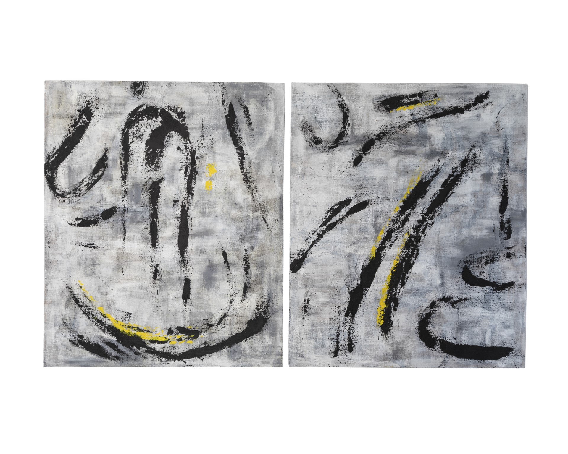 Le opere si sviluppano con un’armonia cromatica essenziale: quasi sempre due colori per ogni quadro, scelti per evocare contrasti e assonanze emotive, come in una composizione musicale. Blu su nero, rosso su bianco, nero e grigio: ogni accostamento risuona con una propria frequenza, traducendo il suono in un impatto visivo immediato e profondo.