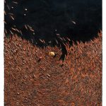 Non manca infatti soltanto il “peso” in sé della Natura ma a venire meno sono i termini stessi che consentono una “pesatura”. La bilancia oggi è divenuta fortemente instabile e quindi è non più idonea a pesare qualsiasi cosa. I prodotti da pesare sfuggono, scemano come irraggiungibili semi al vento fuoriusciti maldestramente dalla piccola scatola posta sul piatto della bilancia che dovrebbe contenerli, trattenerli. Di questo ci racconta con grande forza Il peso della natura del 2019 dove Petrocchi ha immaginato un bosco in cui il vento piega gli alberi e fa volare i baccelli e le foglie a terra. In questa natura inquieta, agitata, torna possibile “pesare”, cioè ponderare o equilibrare le cose solo ricercando uno a uno i semi ed i baccelli che, straniti dal vento, alla fine si depositano a terra.