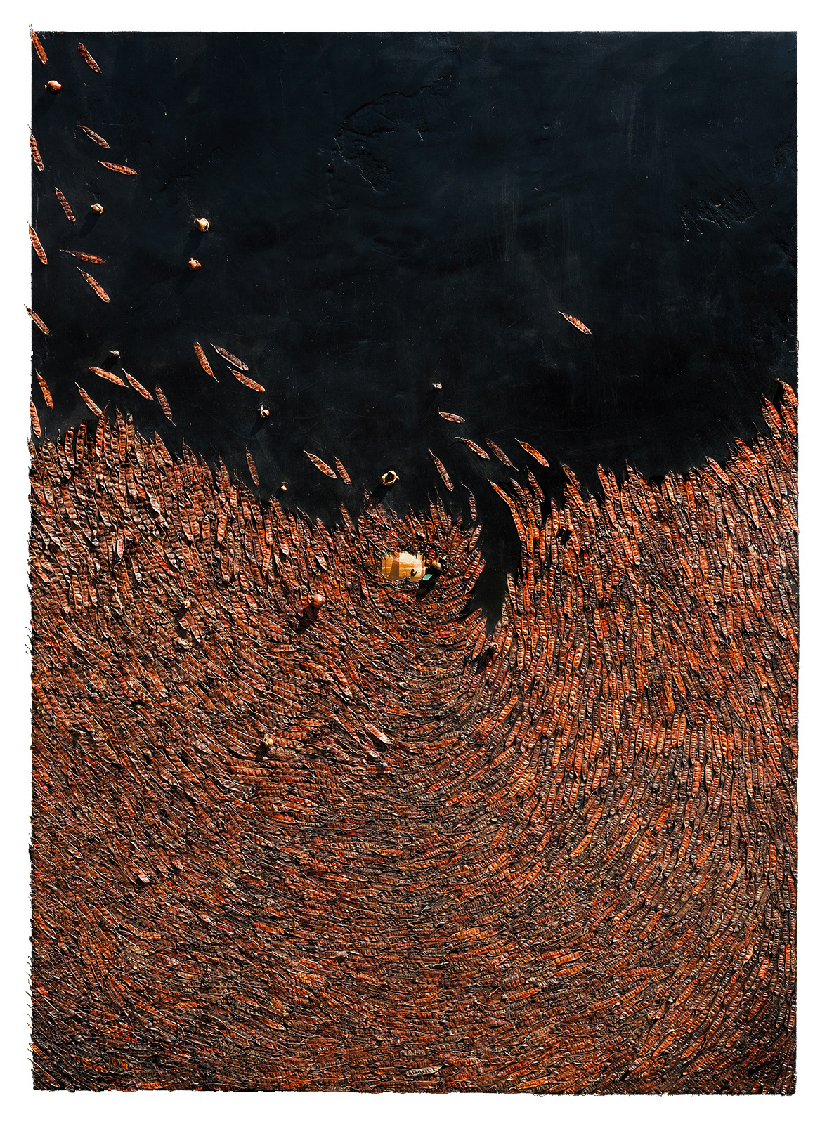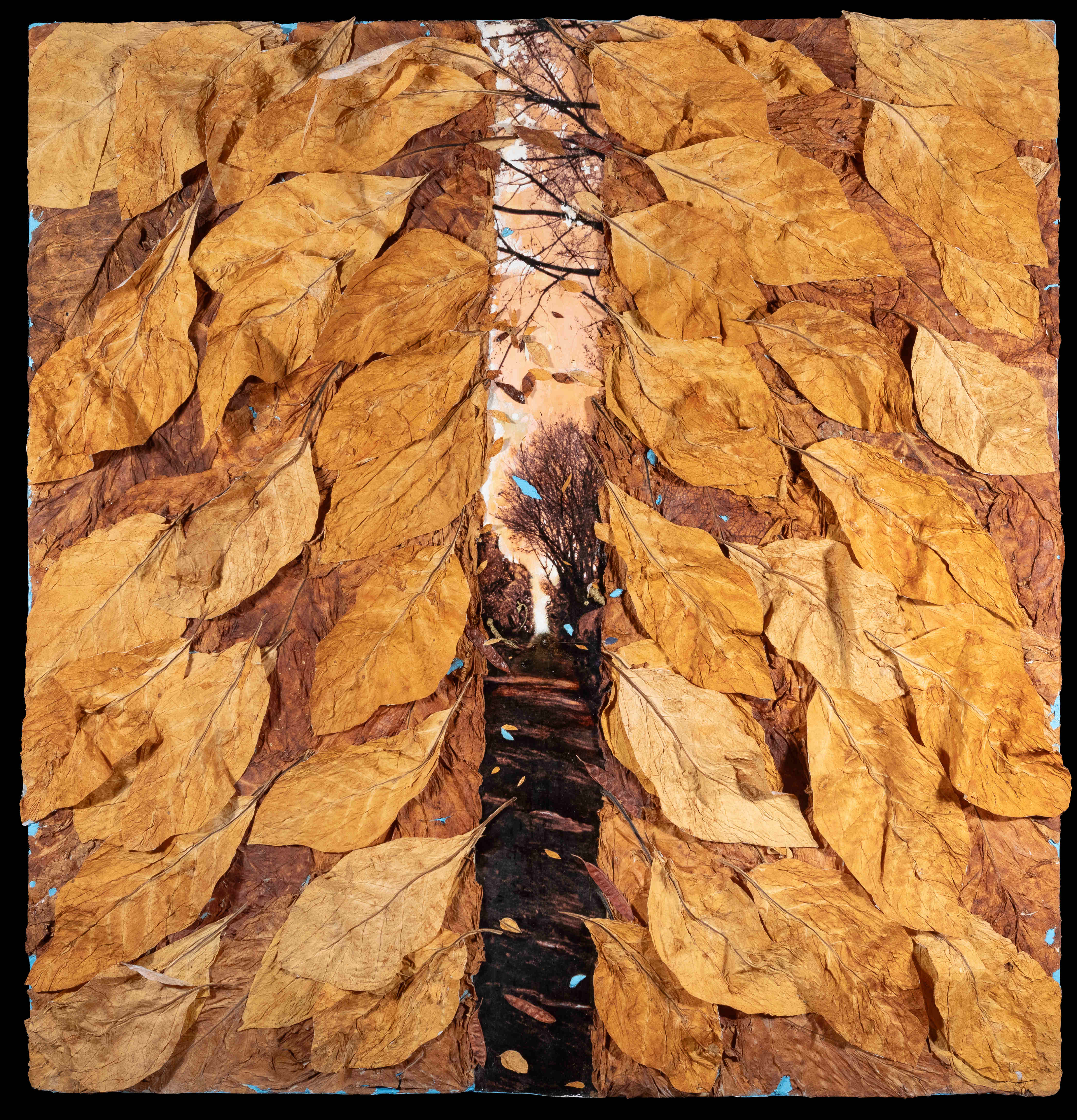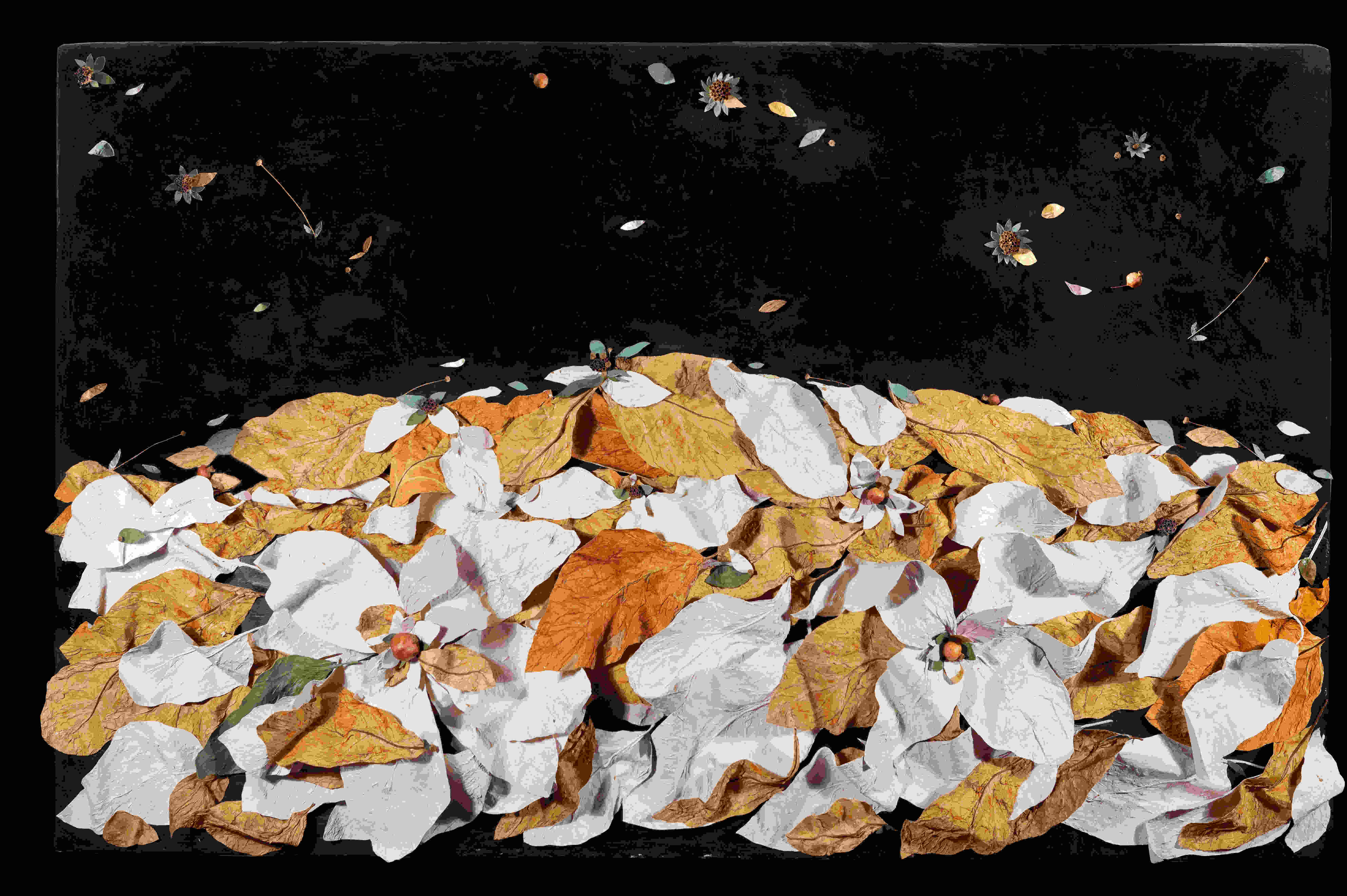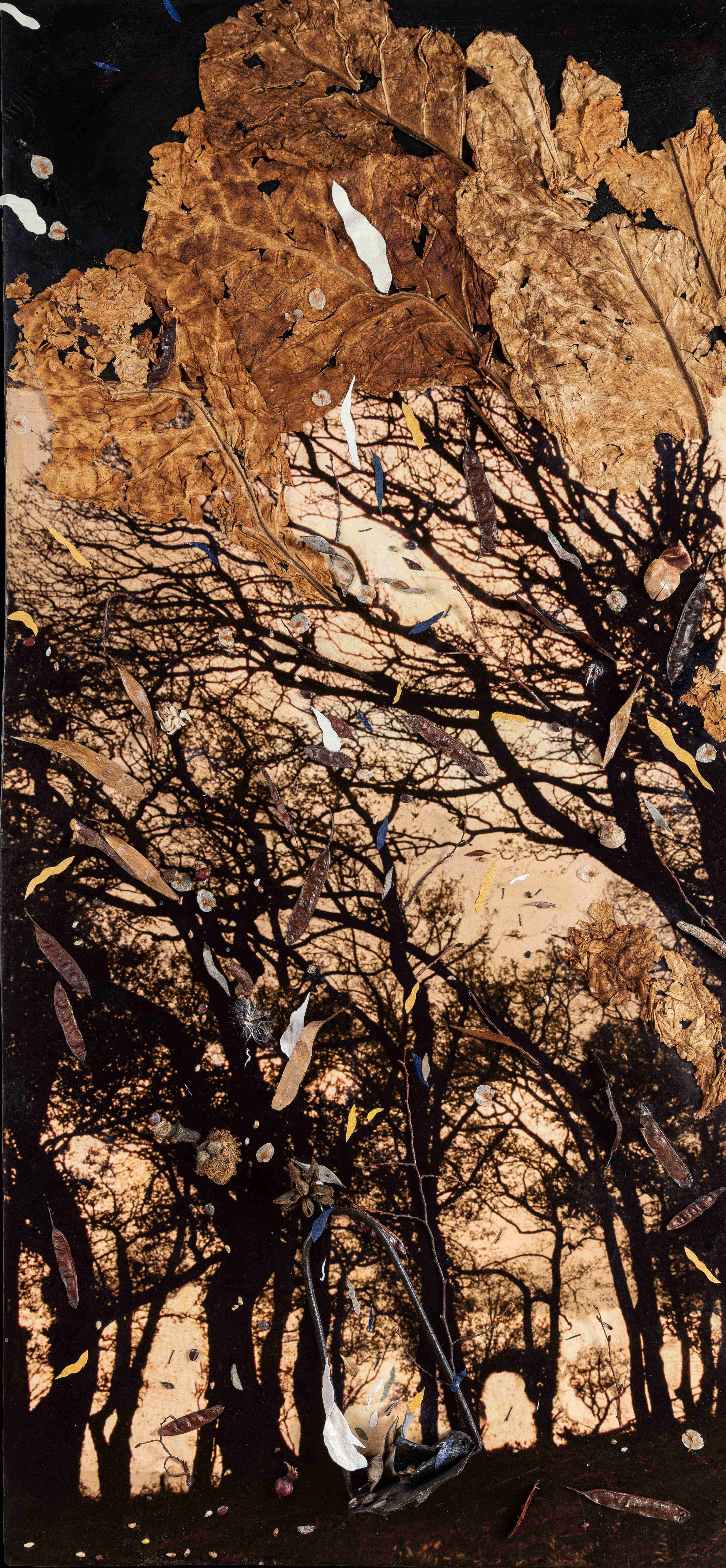 I collage di Petrocchi uniscono infatti elementi fotografici e naturalistici di forte impatto emotivo, di grande forza evocativa come testimoniano in mostra sia i primi lavori come Viale profondo (2013) , sia il più recente …e se i melograni, il tabacco, la santolina e la salvia selvatica fossero dispersi nell’universo… (2024). Qui le foglie di tabacco sono disposte su una superficie incurvata, come quella della Terra, come se si fossero ammassate ricoprendola interamente. Ma in realtà tendono a staccarsi dalla superficie e a volare via disperdendosi nel cielo dell’Universo e con esse le altre essenze di melograni, salvia selvatica, santolina, e gli altri baccelli. Il rischio della perdita di elementi naturali può essere, è reale.