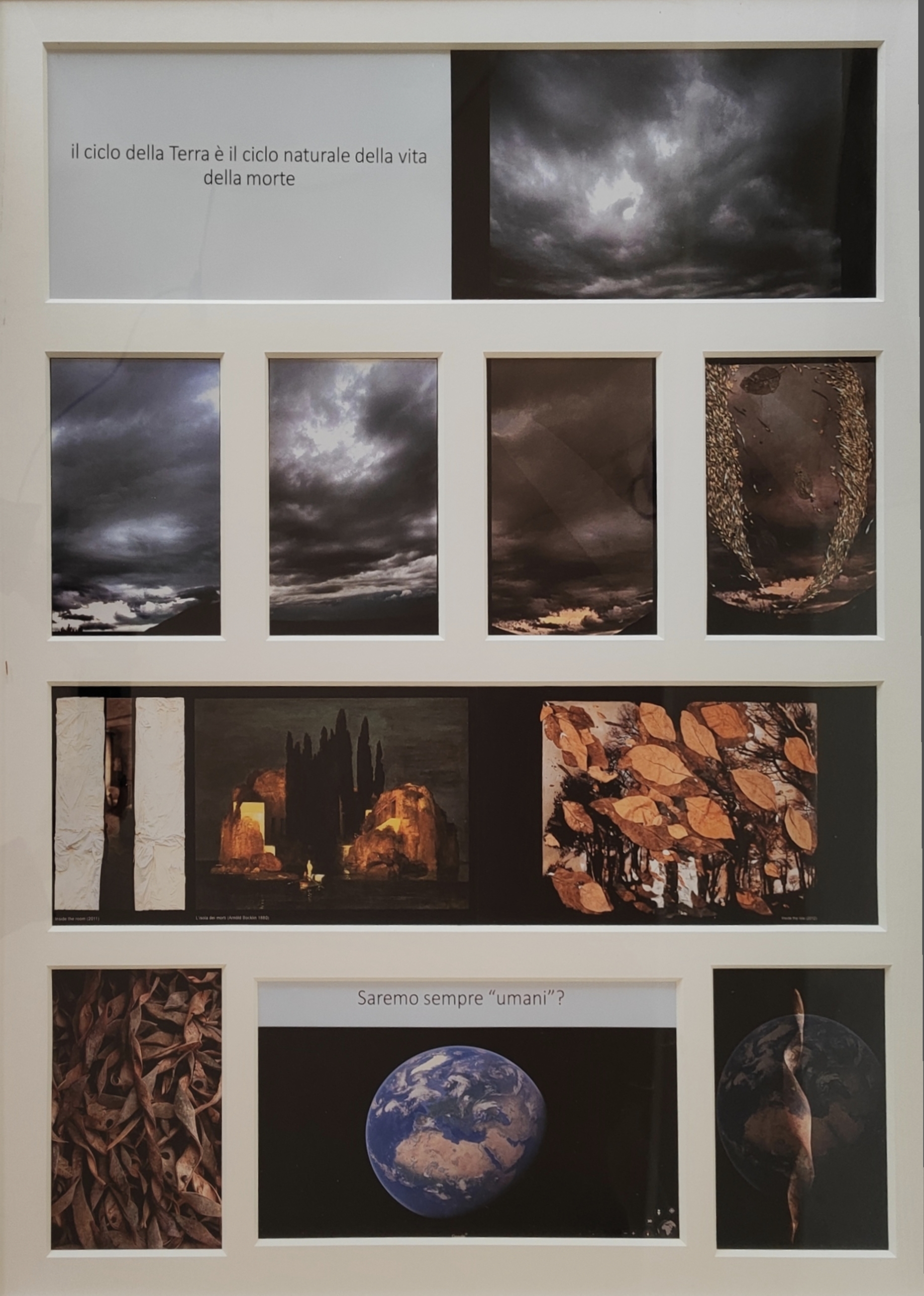 L’opera è stata donata dall’artista al Comune di Senigallia dopo la drammatica alluvione del 2022 che ha colpito la città. L’imponente collage (180x250cm), realizzato nel 2011, rappresenta una metaforica e simbolica “tempesta climatica”, attraverso cui Petrocchi richiama l’attenzione sulla necessità di tutelare la Terra e preservare l’identità dei territori. Il lavoro è composto da una varietà di essenze naturali – tra cui baccelli di glicine, foglie di tabacco, fiori di Altee, nidi di vespe e molti altri.