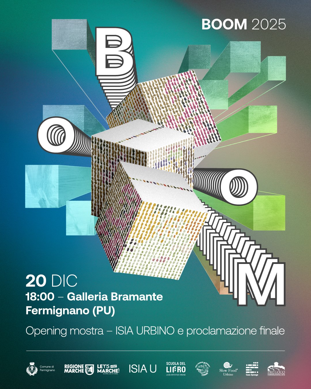 “Anche quest’anno ISIA Urbino – Istituto Superiore per le Industrie Artistiche, eccellenza nazionale nella formazione di progettisti della comunicazione visiva, partecipa con grande entusiasmo a “BOOM: tra cibo e arte il futuro”, un progetto che celebra l'incontro tra gusto, arte e cultura visiva. Nel tempo si è consolidata una collaborazione solida tra il nostro Istituto e il Comune di Fermignano, lavorando fianco a fianco su progetti rivolti alla comunità e al territorio. Supervisiono personalmente la creazione dei packaging ideati dalle studentesse e dagli studenti di ISIA Urbino, ispirati dall’opera dell’artista Angelo Bellobono, che riflette su identità, sostenibilità, comunità e rapporto con l’ambiente. Le studentesse e gli studenti stanno sviluppando i loro lavori con l’obiettivo di creare diversi tipi di packaging, utilizzando linguaggi differenti della grafica, della tipografia e dell’illustrazione, dopo aver incontrato l’artista Angelo Bellobono, che ha condiviso con loro la sua ricerca. I progetti saranno tutti protagonisti di una mostra collettiva.” Prof. Giuseppe Roberto Biagetti - Direttore