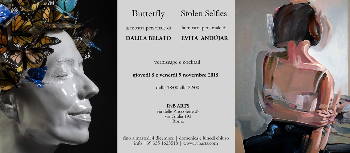 RvB Arts è lieta di presentare STOLEN SELFIES, la mostra personale dell'artista spagnola EVITA ANDÚJAR, e BUTTERFLY, la mostra personale della scultrice siciliana DALILA BELATO, in un ipotetico arco che unisce due sponde del Mediterraneo, ricche di suggestioni e modalità espressive volte al recupero del genere figurativo.