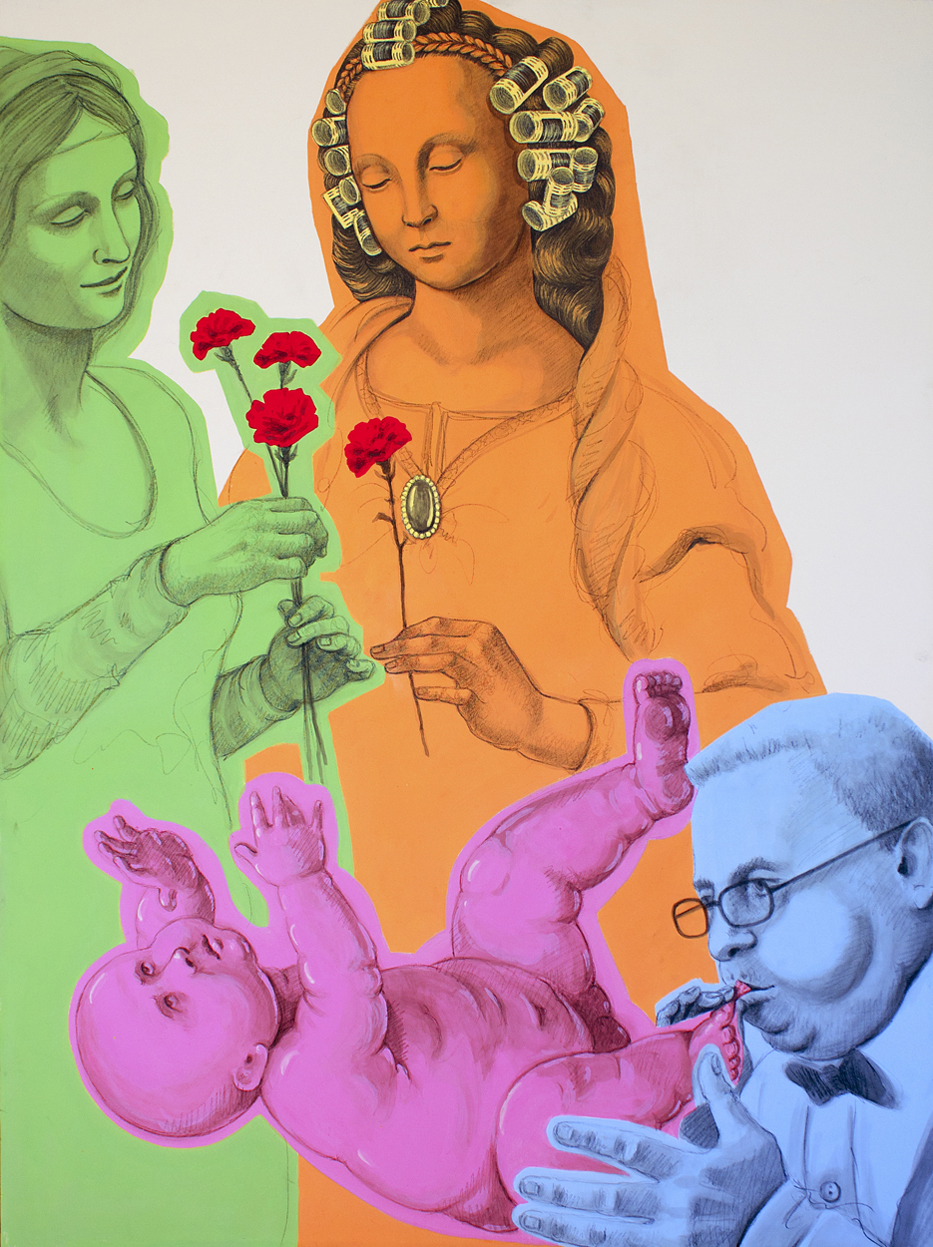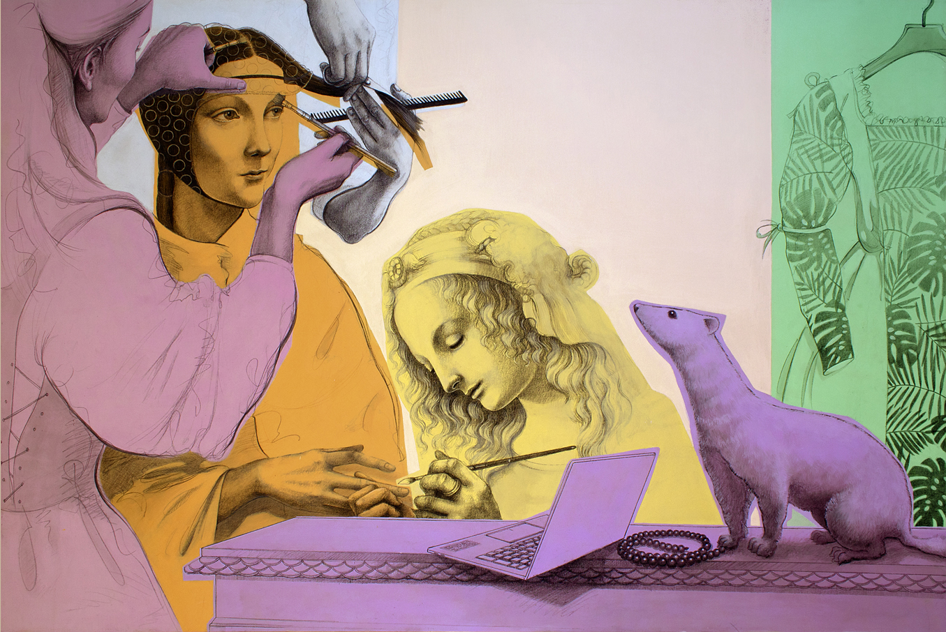 Vania Elettra Tam, per contro, si è idealmente intrufolata nel segretissimo backstage leonardesco, ricostruendo le dinamiche che hanno consentito la creazione di alcuni noti capolavori. Nell’atelier acconciatrici, sarte, truccatrici, semplici garzoni, tutti stanno dando il meglio di sé per allestire la perfetta rappresentazione… Tutto ciò accade nella mente ironico-sognatrice di Vania, attraverso una smitizzazione sorridente, che scivola con leggerezza e intelligenza verso una dimensione surreale, dove il tempo è svuotato d’ogni rigidità e diviene un’entità plasmabile, depistabile, non indispensabile. Non mancano tocchi caricaturali, in un continuo rimando tra finzione e immaginazione, dove l’apparente realismo rappresentativo precipita di fatto la realtà in un vortice di nonsense e anacronismi.